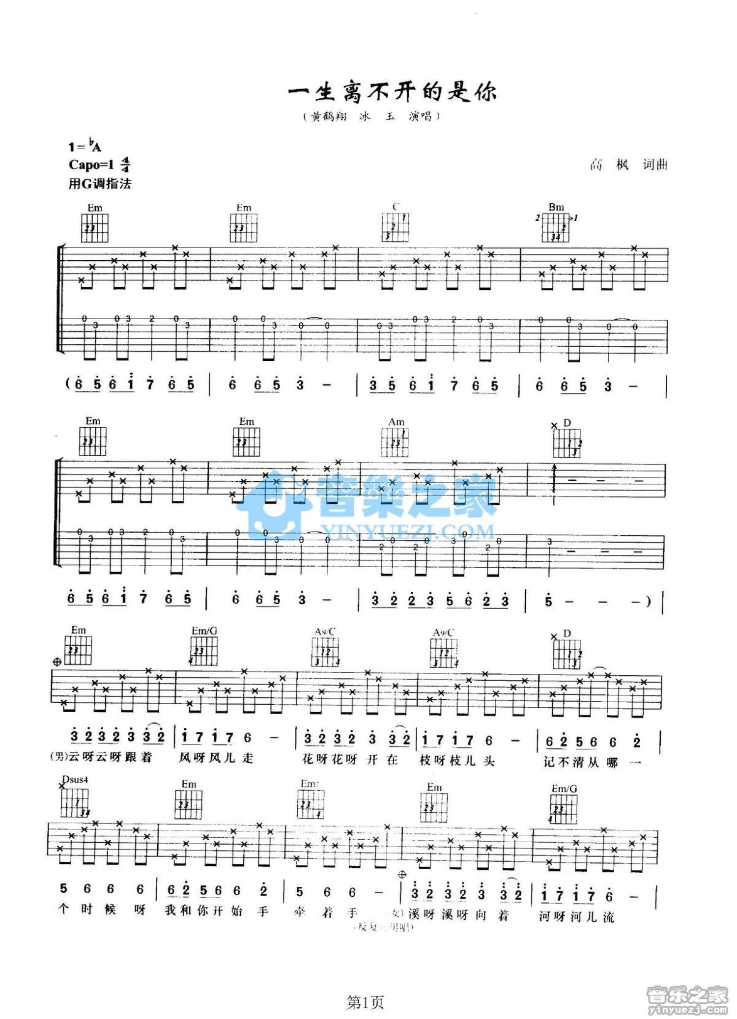 一生离不开的是你吉他谱 - 黄鹤翔/冰玉 - G调吉他弹唱谱