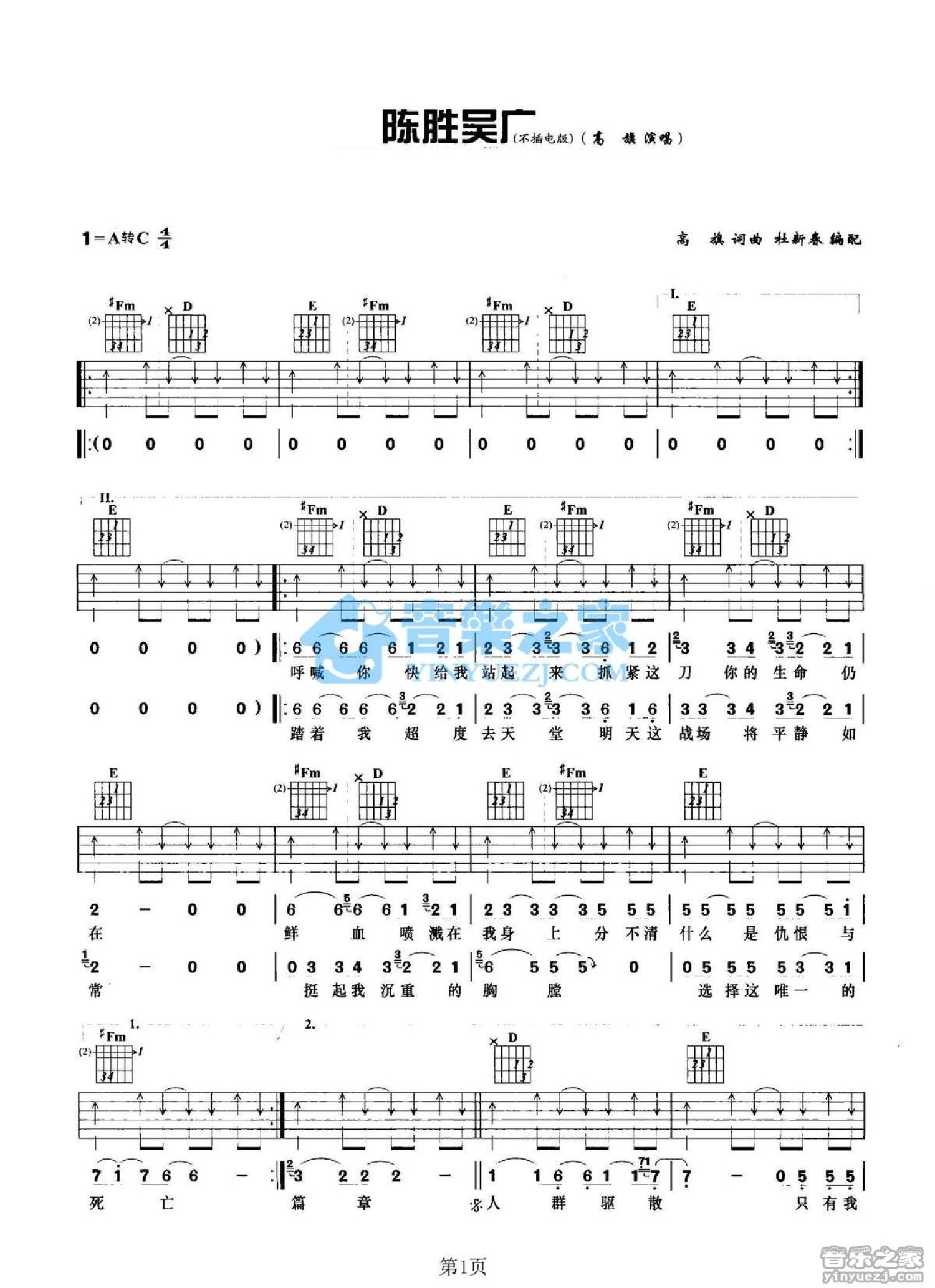 陈胜吴广吉他谱 - 高旗 - A调吉他弹唱谱 - 双吉他不插电版