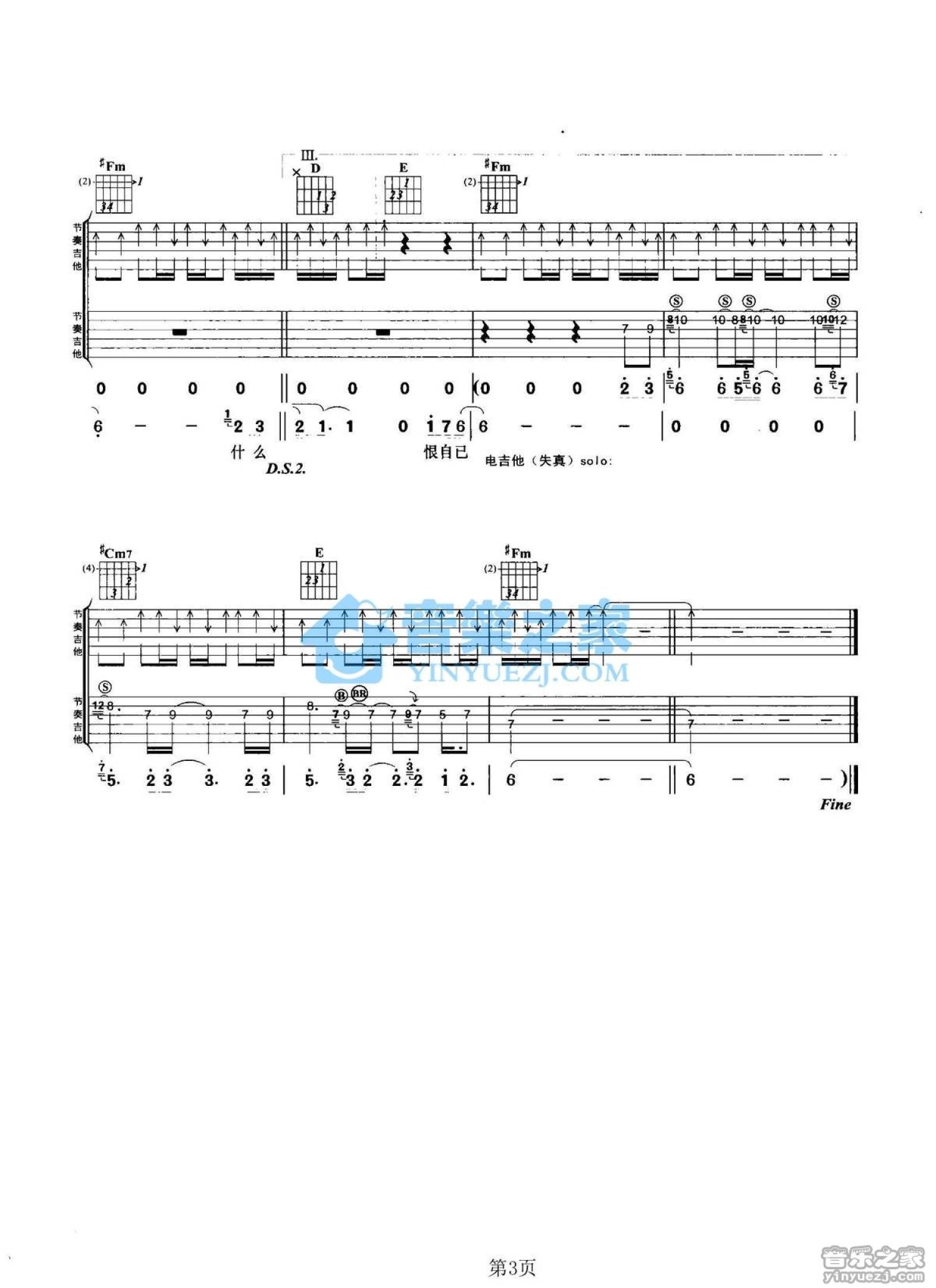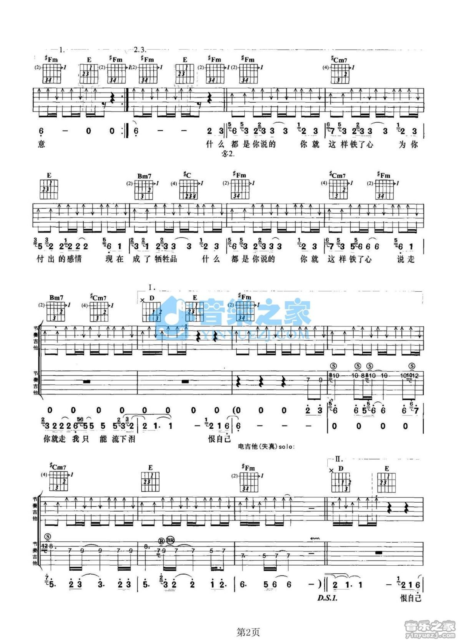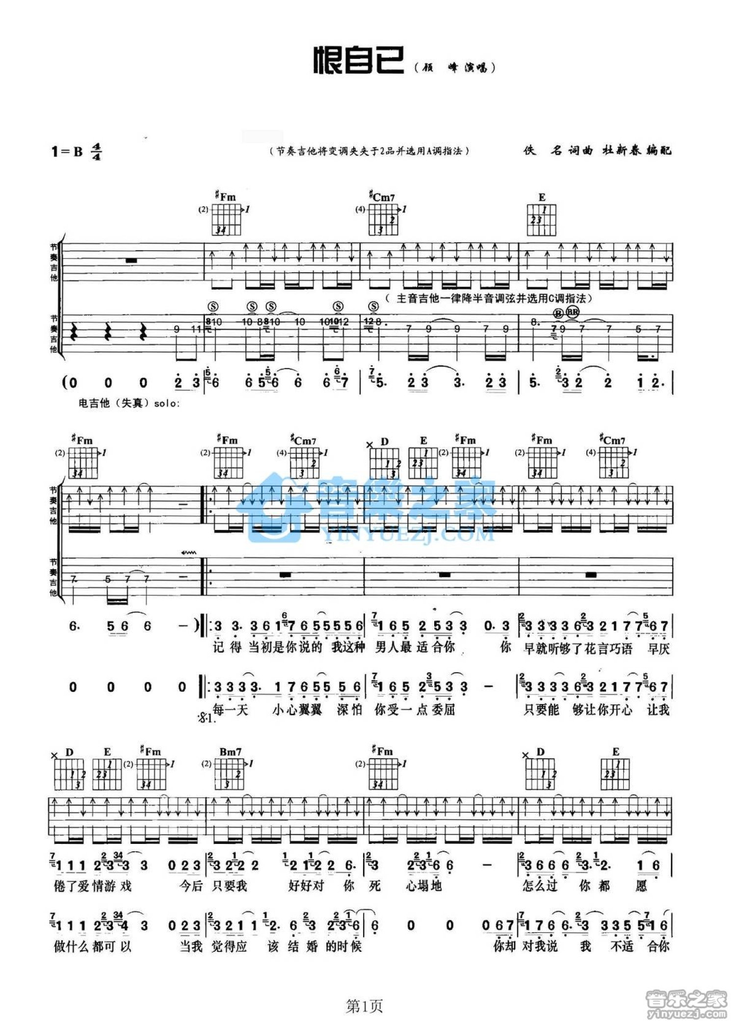 曲谱介绍: A调双吉他版顾峰《恨自己》吉他弹唱六线谱
