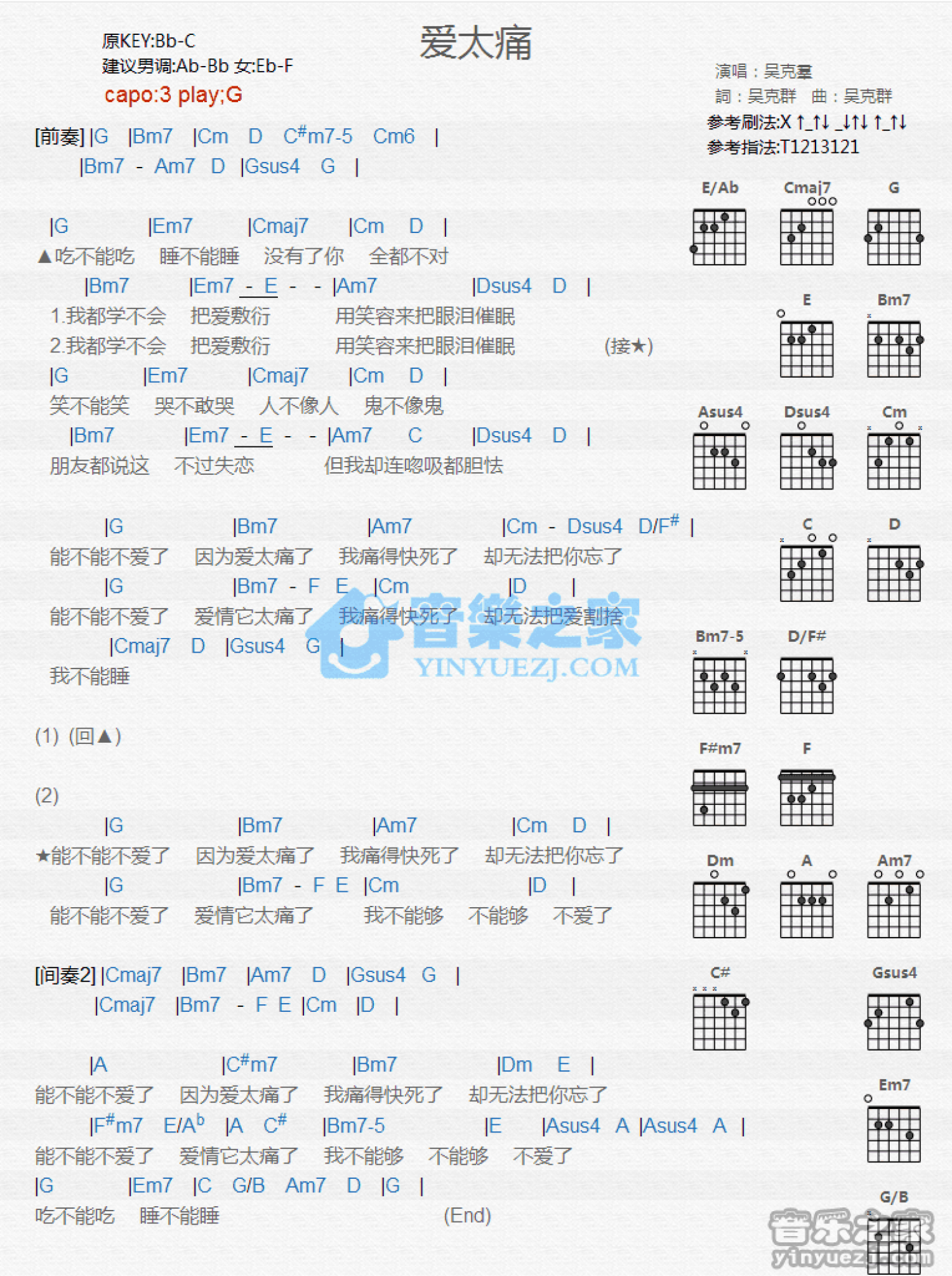 曲谱介绍: G调版吴克t《爱太痛》吉他和弦弹唱谱