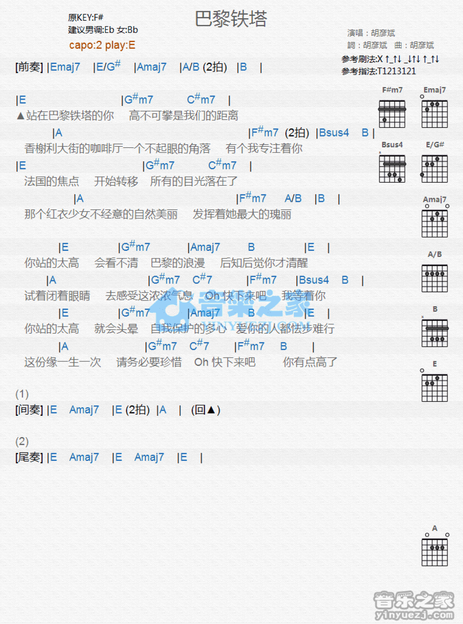 曲谱介绍: E调版胡彦斌《巴黎铁塔》吉他和弦弹唱谱