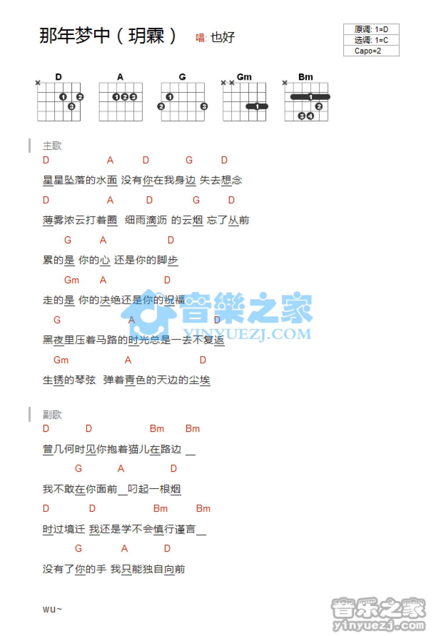 曲谱介绍: D调版《那年梦中》吉他和弦弹唱谱