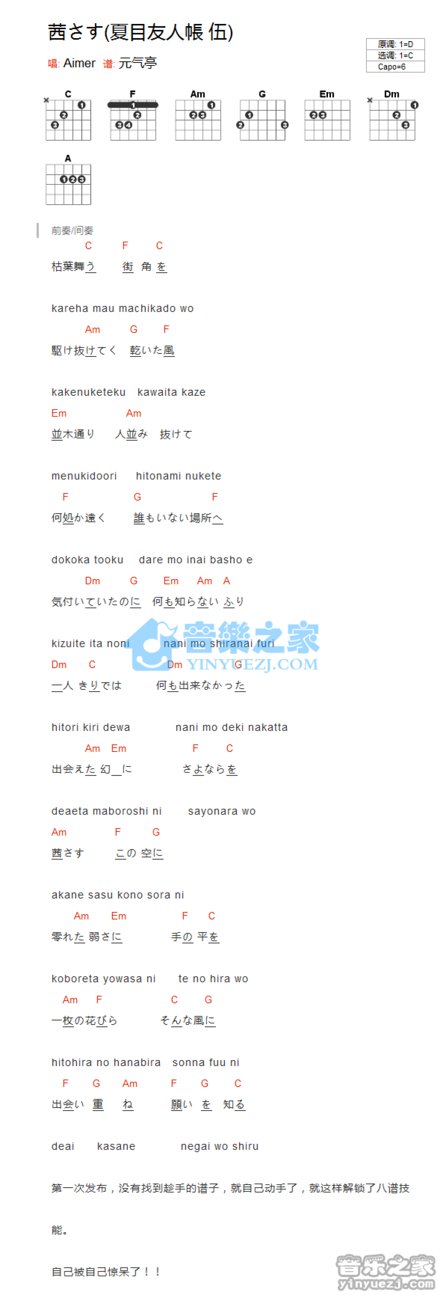 曲谱介绍: C调版夏目友人《茜さす》吉他和弦弹唱谱