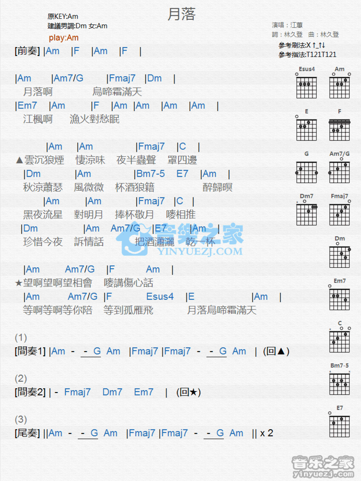 曲谱介绍: Am调版江蕙《月落》吉他和弦弹唱谱