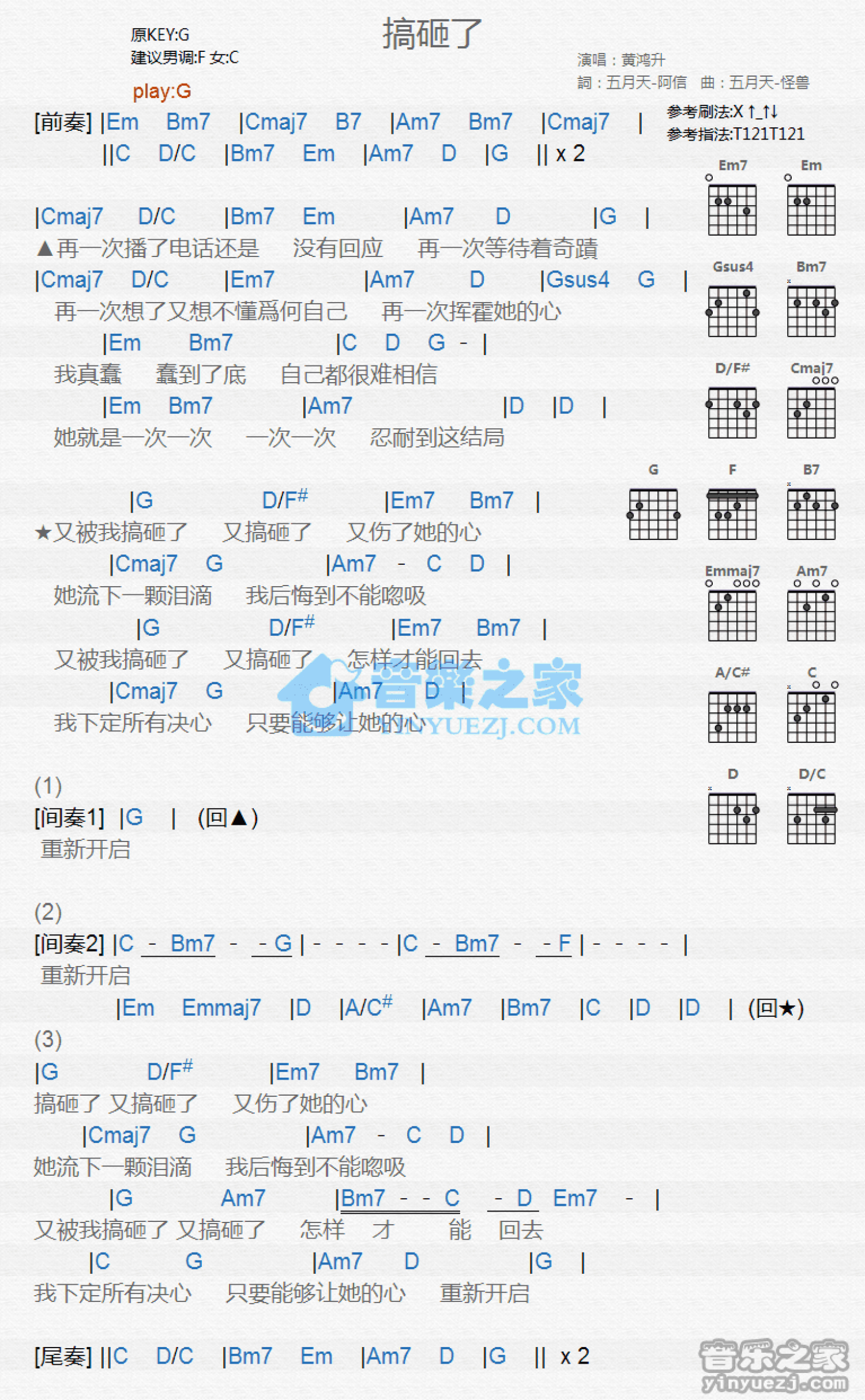 曲谱介绍: G调版黄鸿升《搞砸了》吉他和弦弹唱谱