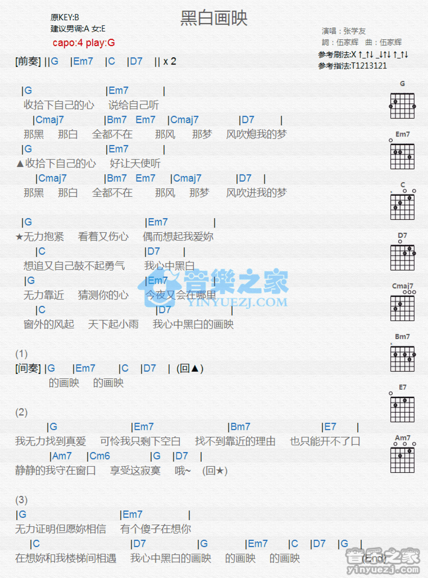 曲谱介绍: G调版张学友《黑白画映》吉他和弦弹唱谱