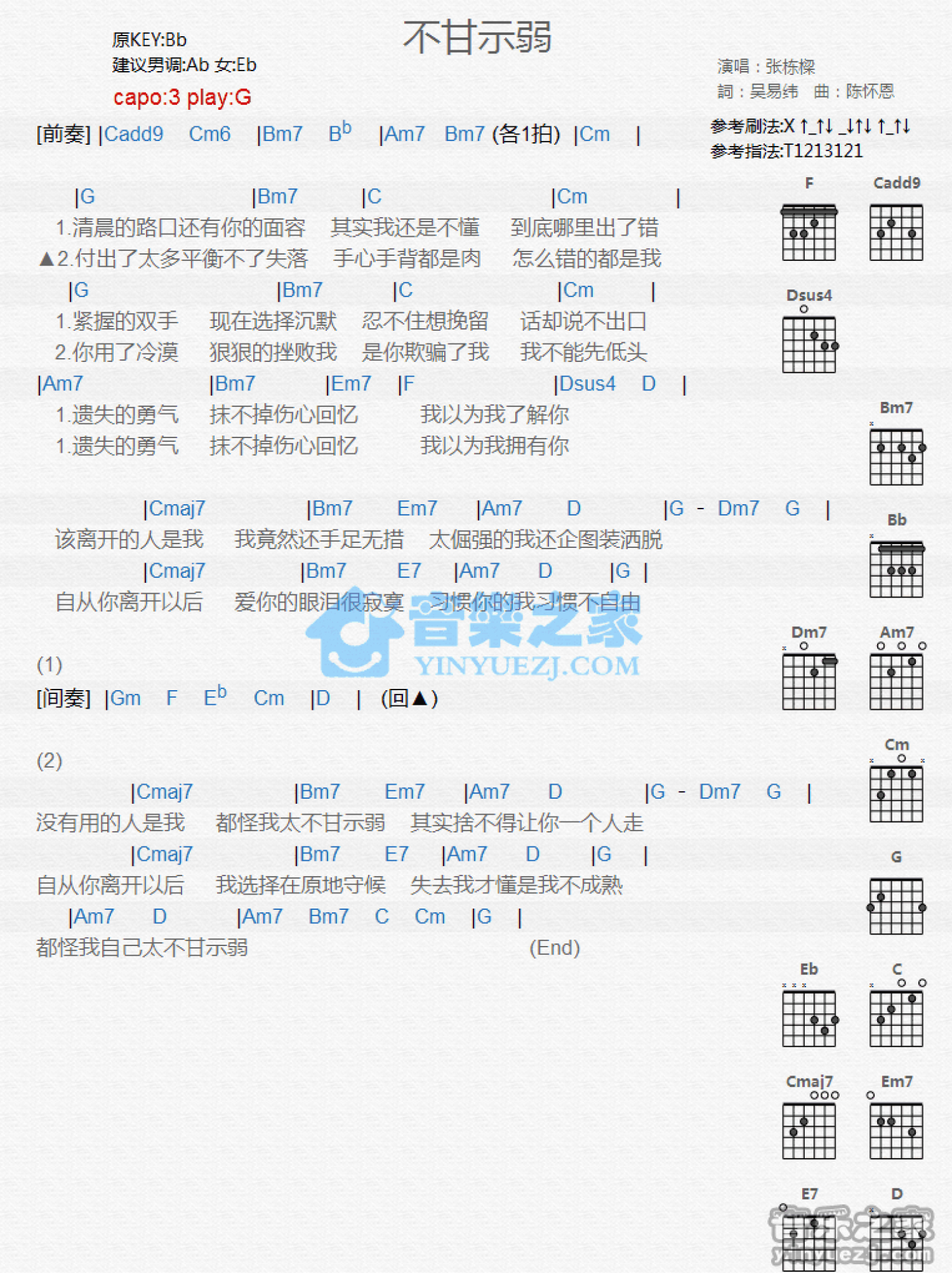 曲谱介绍: G调版张栋梁《不甘示弱》吉他和弦弹唱谱