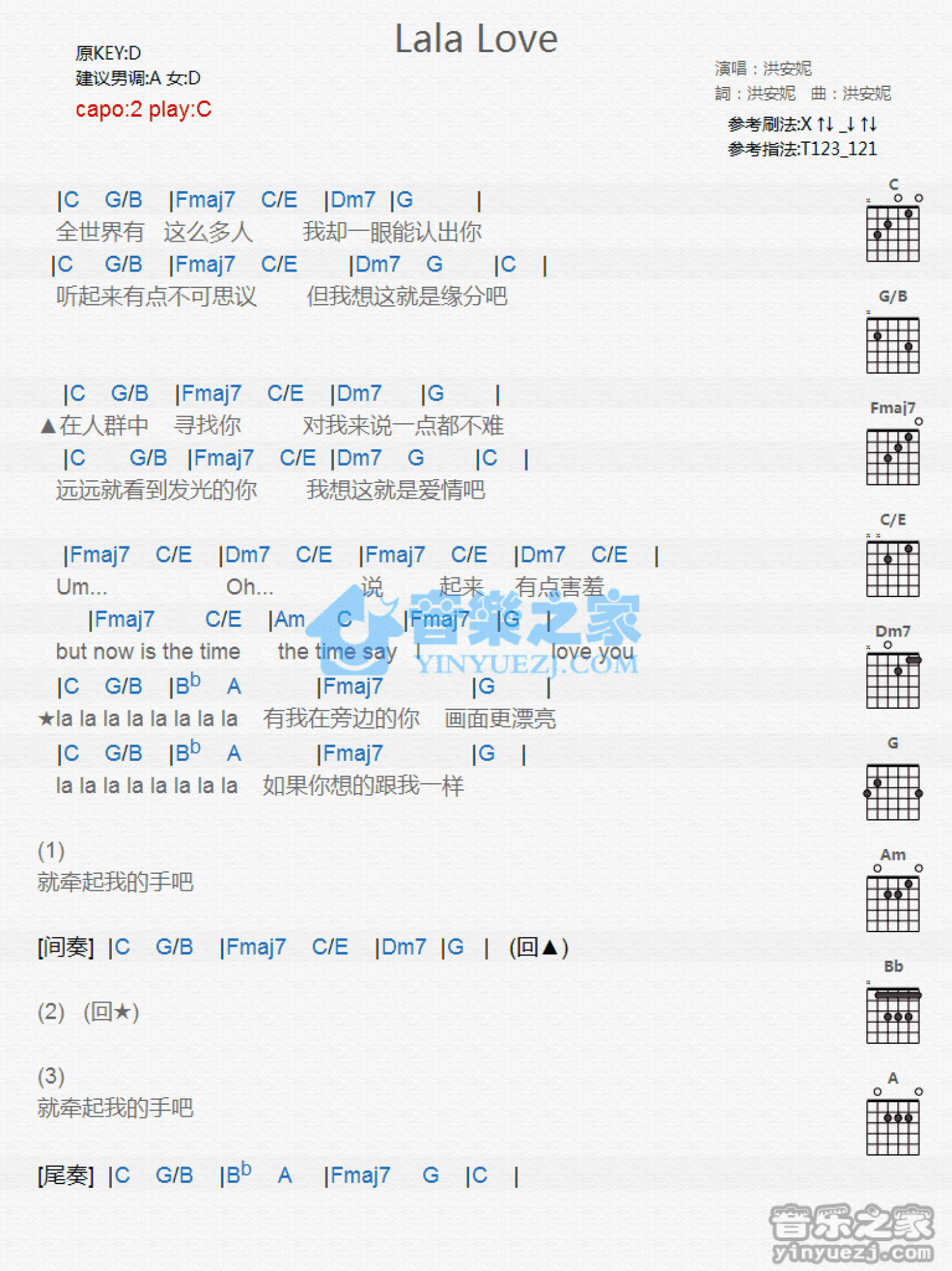曲谱介绍: C调版《lalalove》吉他和弦弹唱谱
