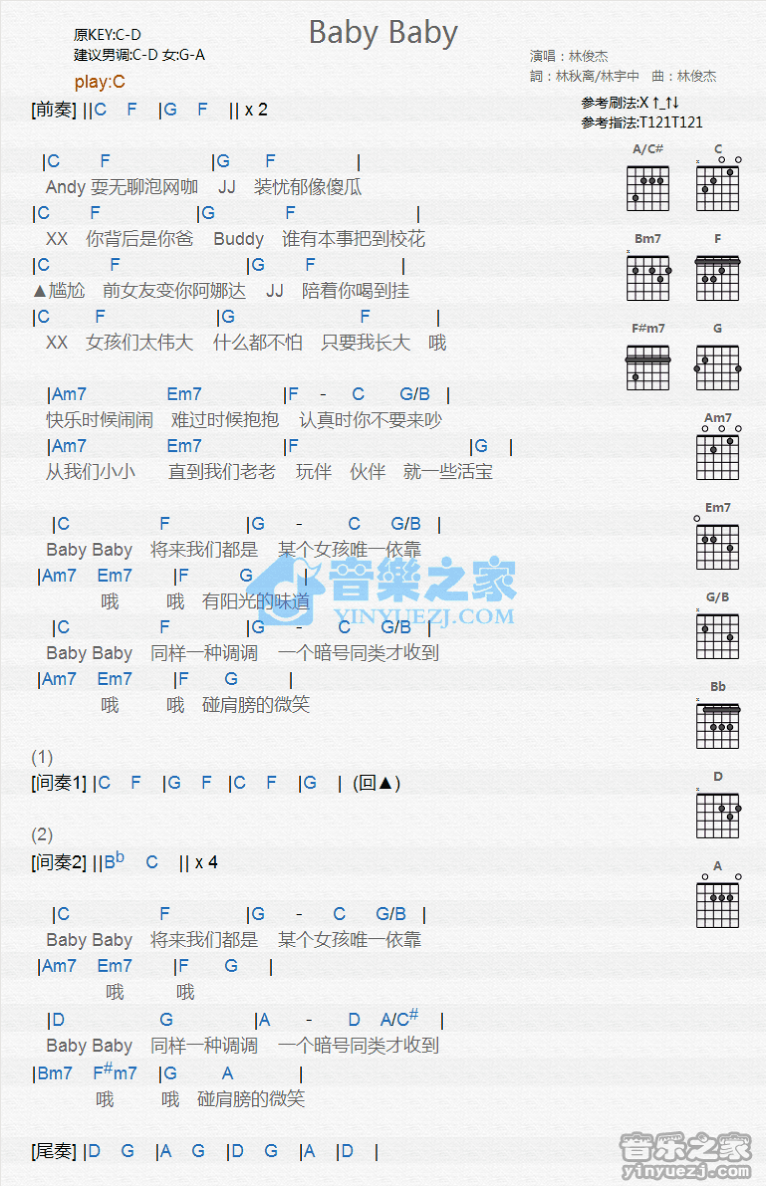 曲谱介绍: C调版林俊杰《BABYBABY》吉他和弦弹唱谱