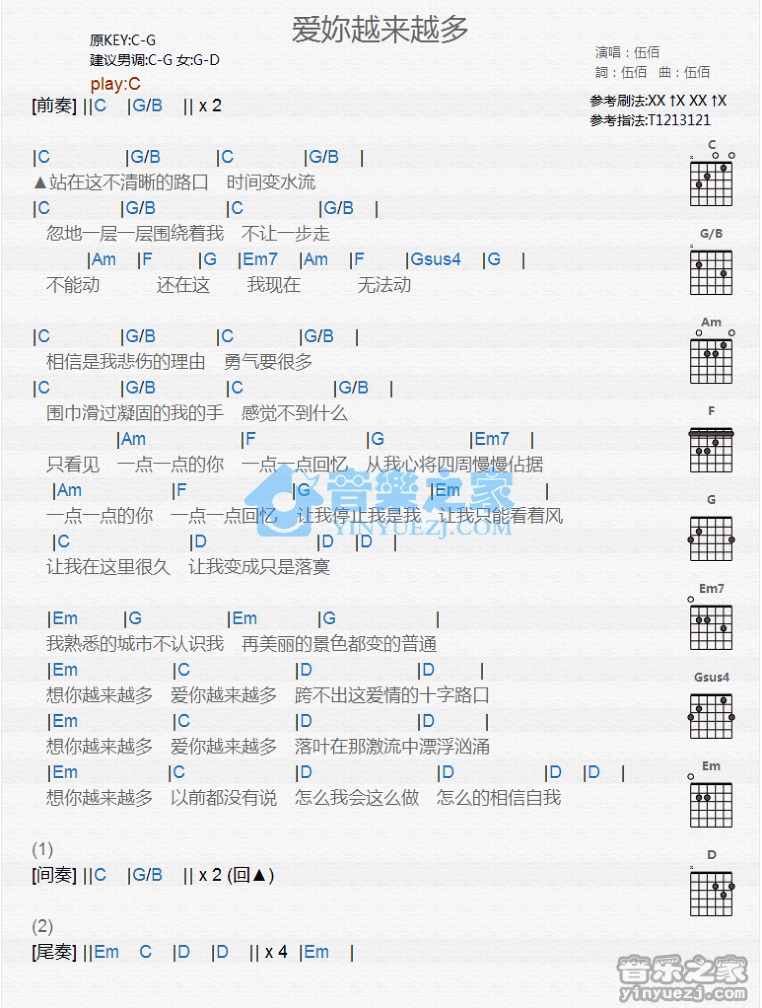 曲谱介绍: C调版伍佰《爱你越来越多》吉他和弦弹唱谱