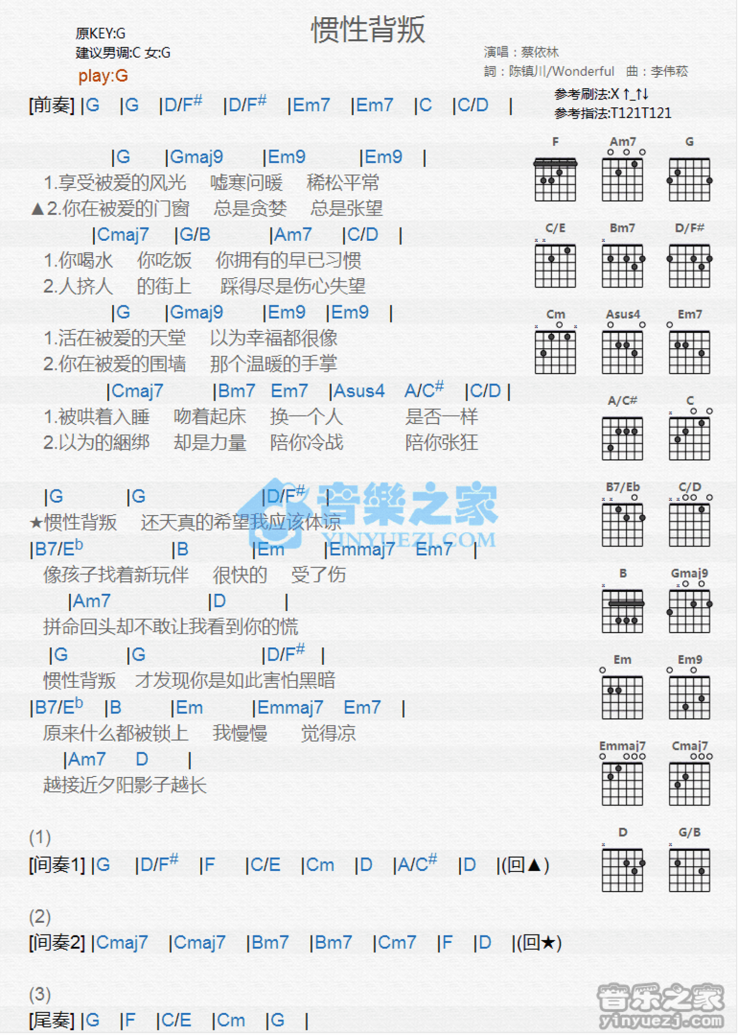 曲谱介绍: G调版《惯性背叛》吉他和弦弹唱谱