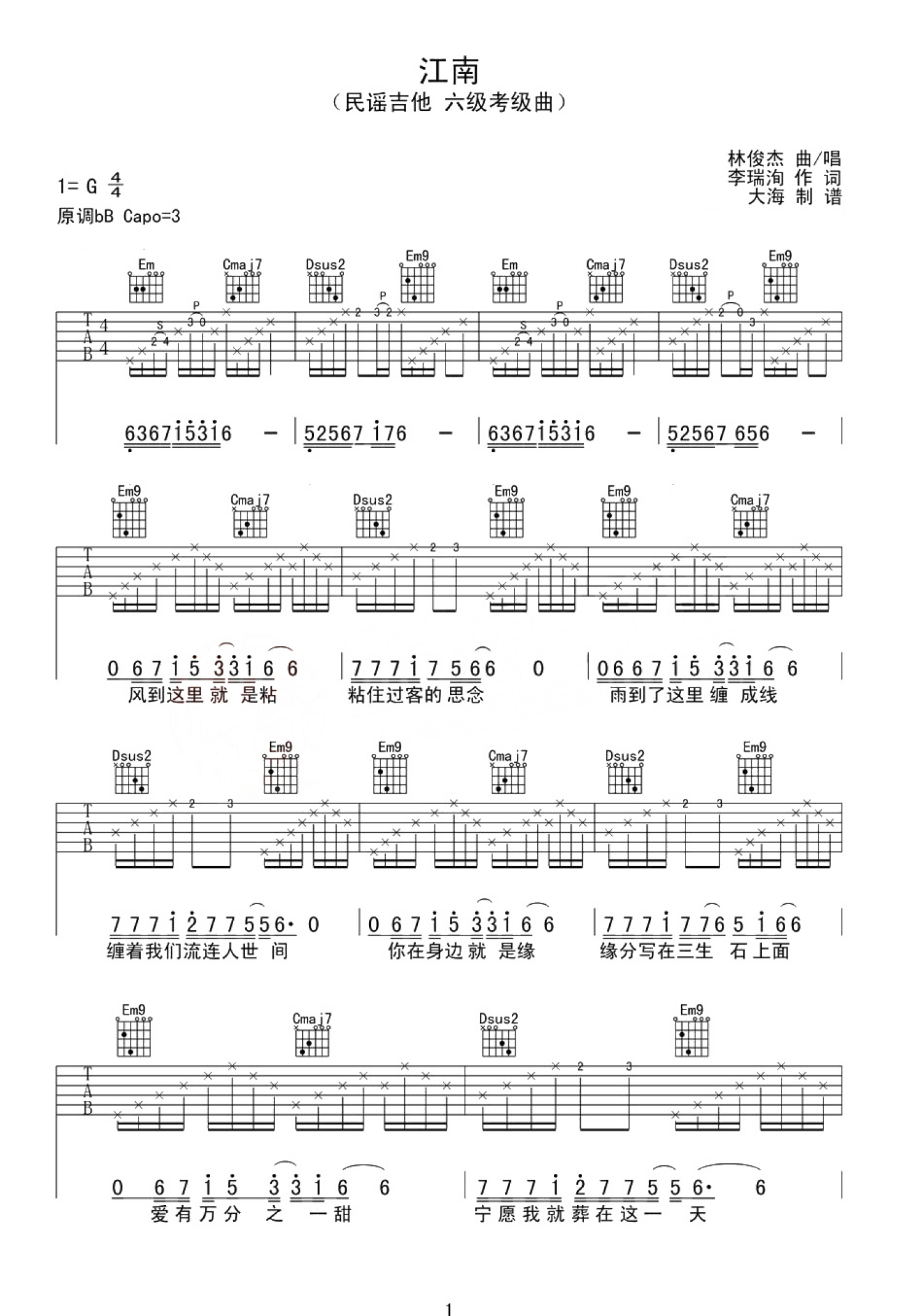 曲谱介绍: 林俊杰江南吉他谱,G调指法,变调夹CAPO第三品。江南吉他弹唱谱,林俊杰经典传唱代表金曲,满满的回忆,不算是深深的爱,却是细水长流的喜欢。