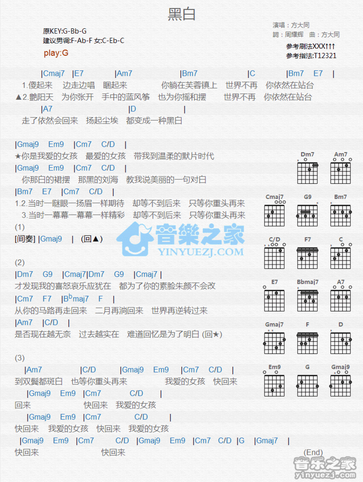 曲谱介绍: G调版方大同《黑白》吉他和弦弹唱谱