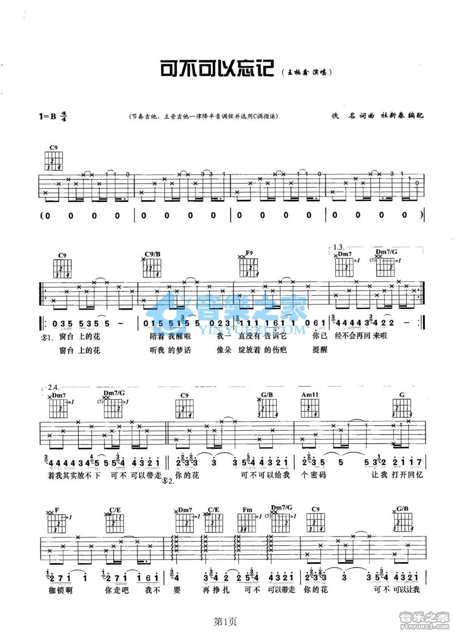 曲谱介绍: C调双吉他版王栎鑫《可不可以忘记》吉他弹唱六线谱