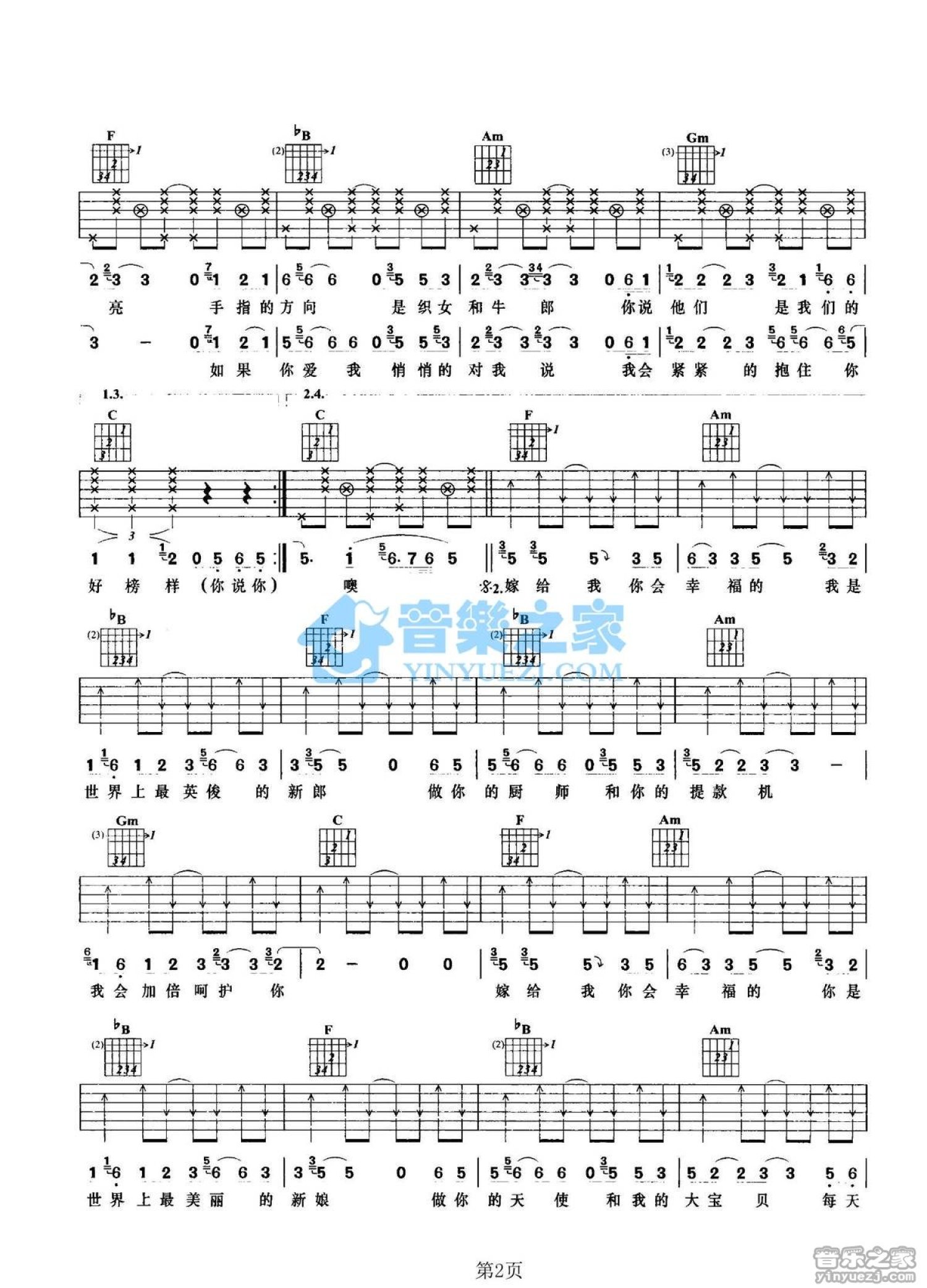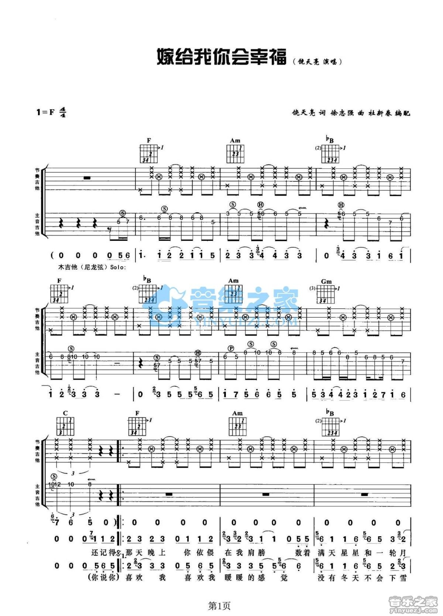 曲谱介绍: F调《嫁给我你会幸福》吉他弹唱六线谱
