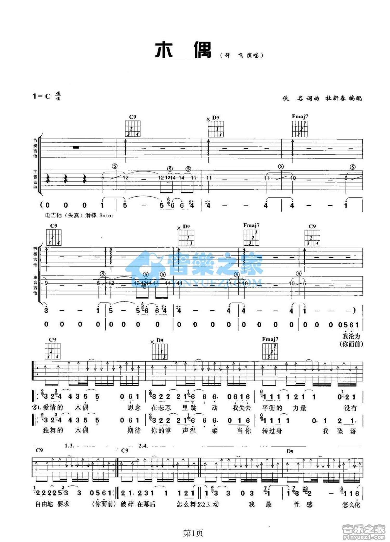 曲谱介绍: C调双吉他版许飞《木偶》吉他弹唱六线谱