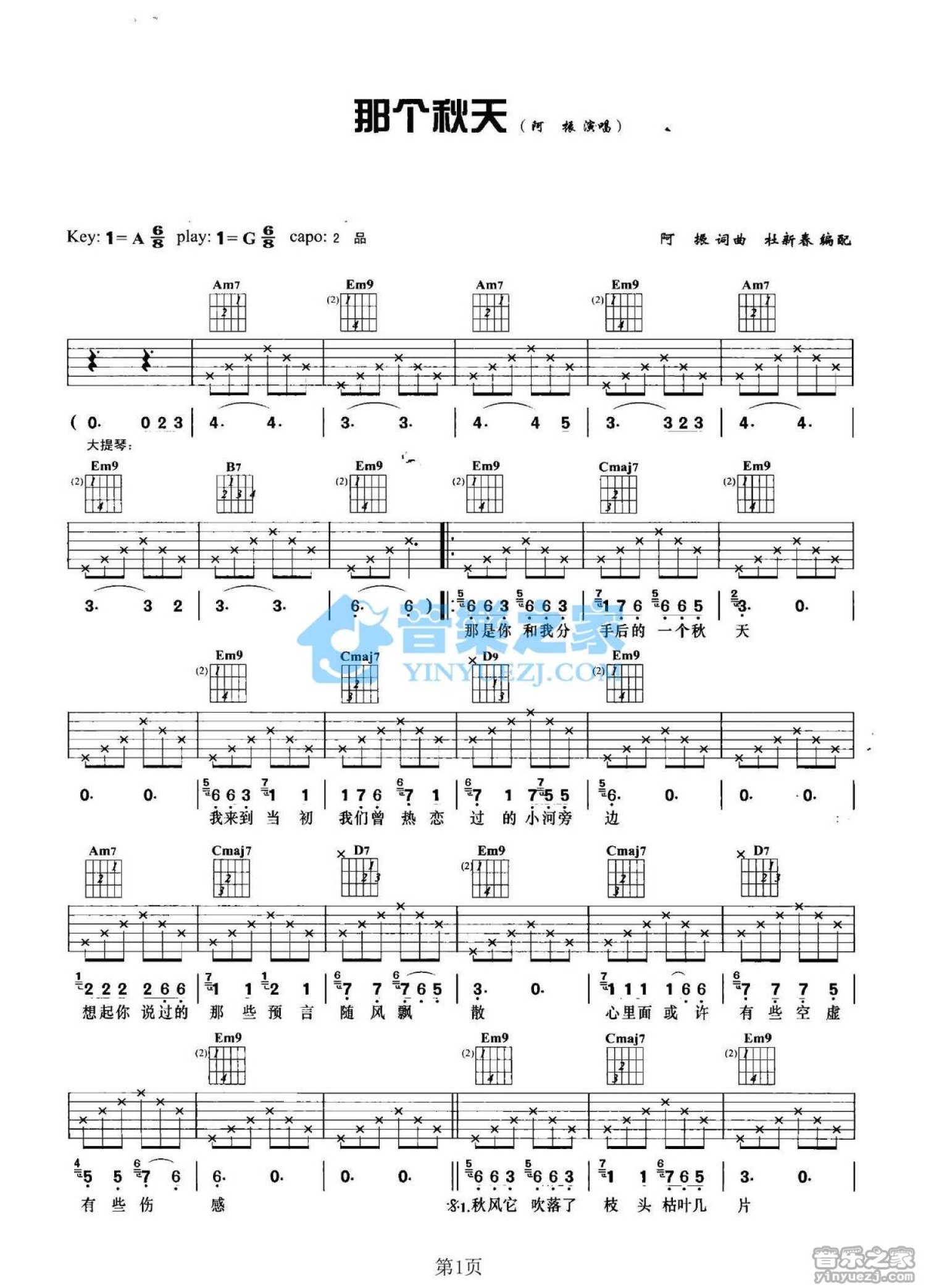 曲谱介绍: G调版阿振《那个秋天》吉他弹唱六线谱
