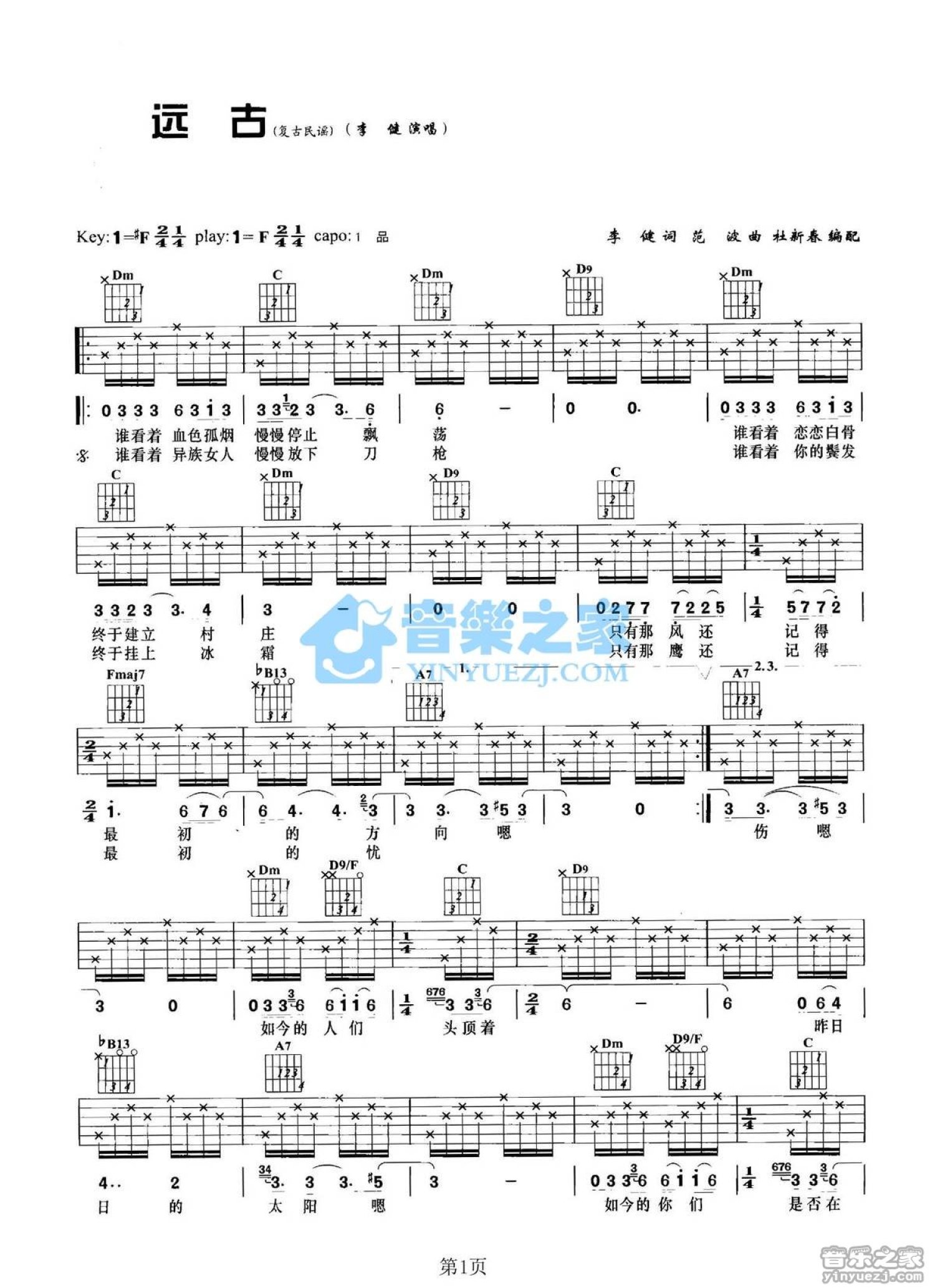 曲谱介绍: F调版李健《远古》吉他弹唱六线谱