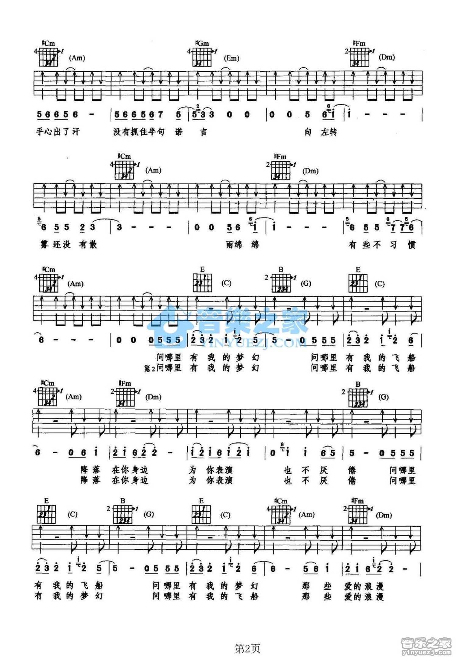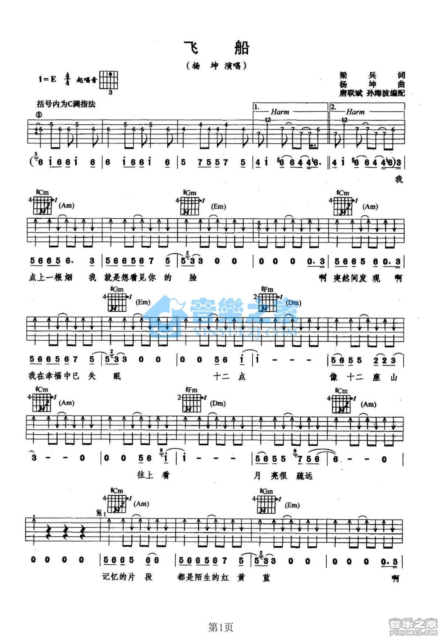 曲谱介绍: E调版杨坤《飞船》吉他弹唱六线谱