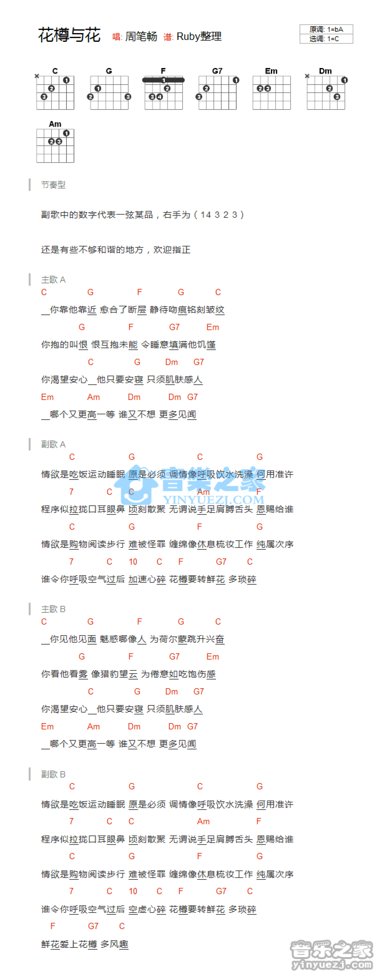 曲谱介绍: C调版周笔畅《花樽与花》吉他和弦弹唱谱