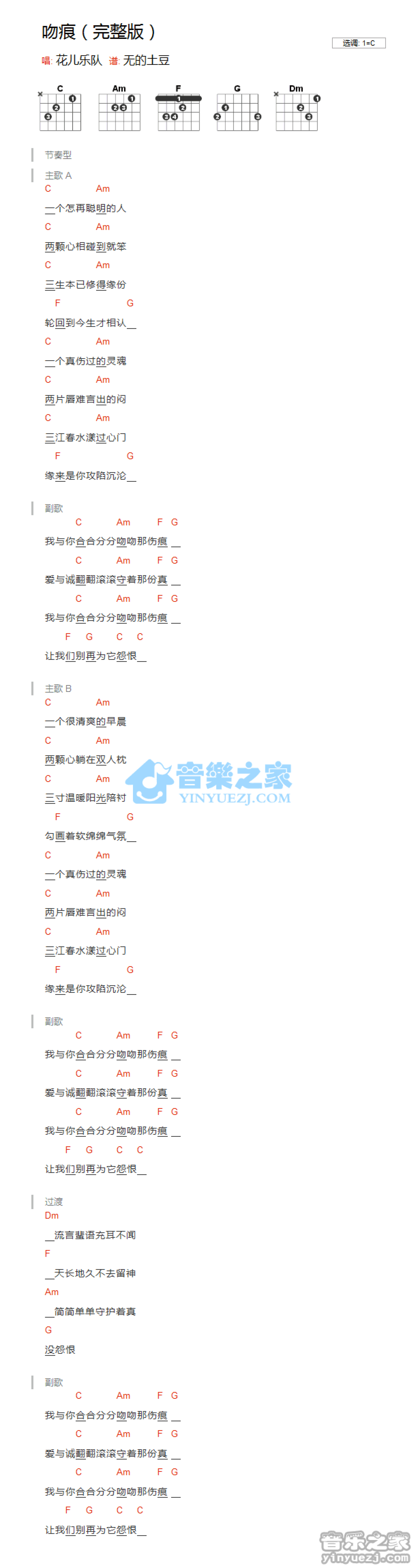 曲谱介绍: C调版花儿乐队《吻痕》吉他和弦弹唱谱