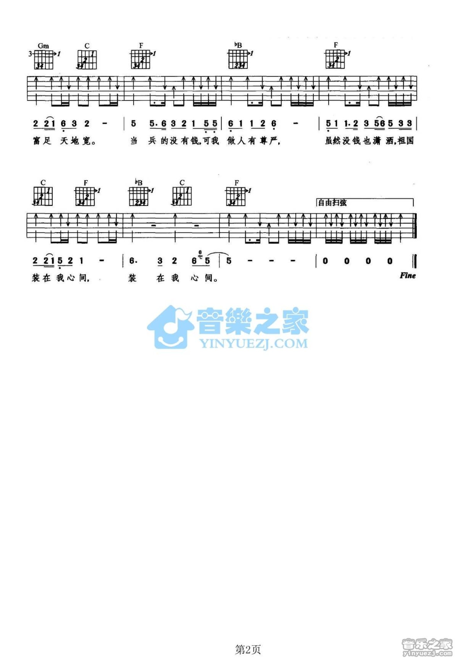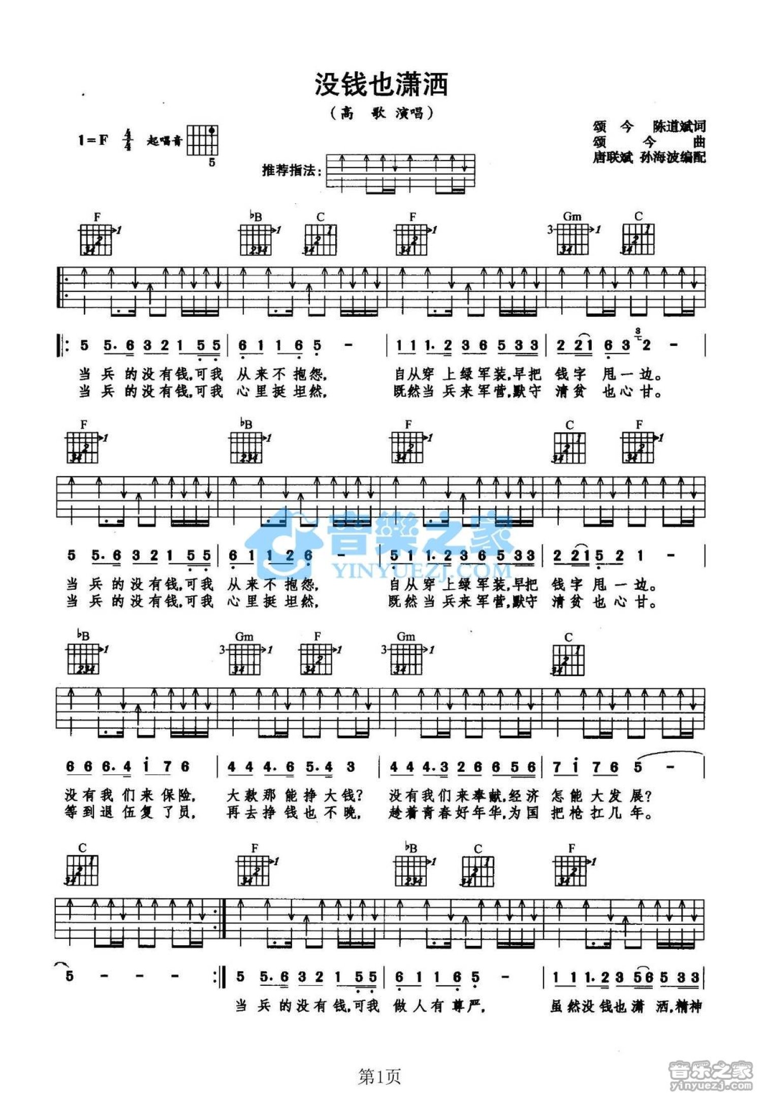 曲谱介绍: F调版高歌《没钱也潇洒》吉他弹唱六线谱
