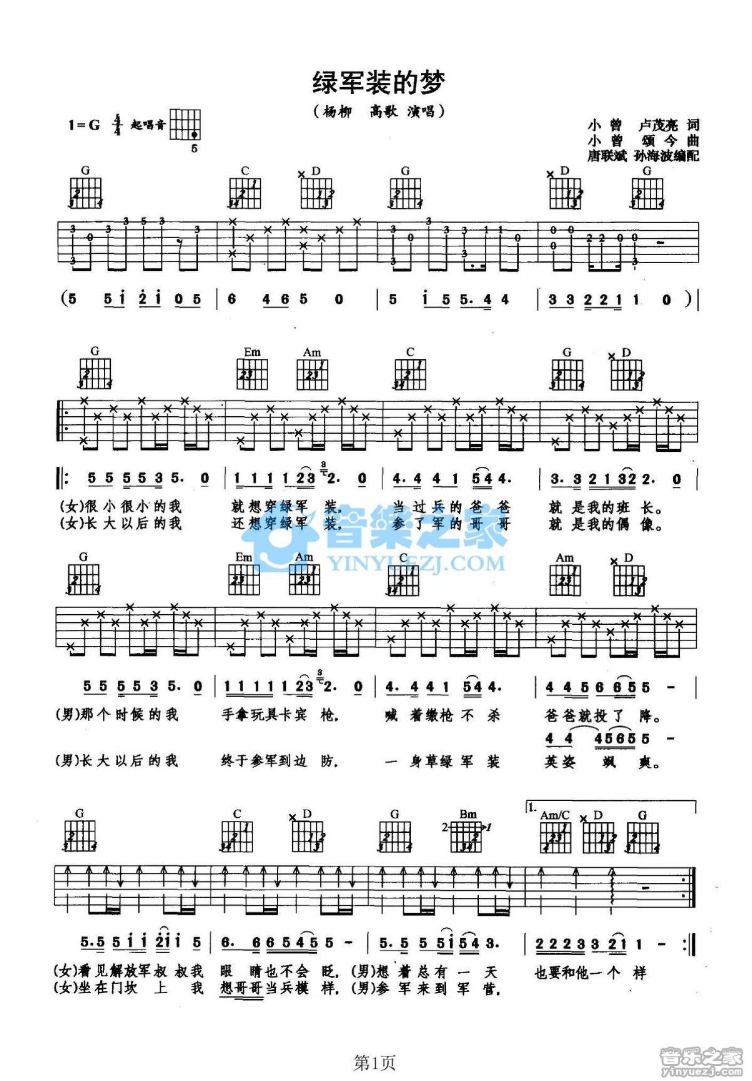 曲谱介绍: G调版杨柳/高歌《绿军装的梦》吉他弹唱六线谱