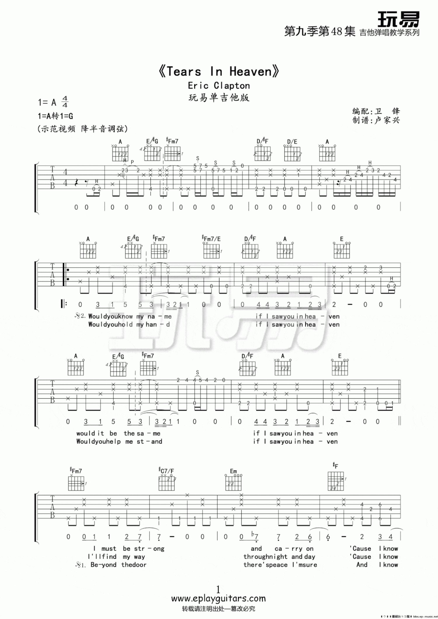 曲谱介绍: 玩易A调原版《TearsInHeaven》吉他弹唱六线谱