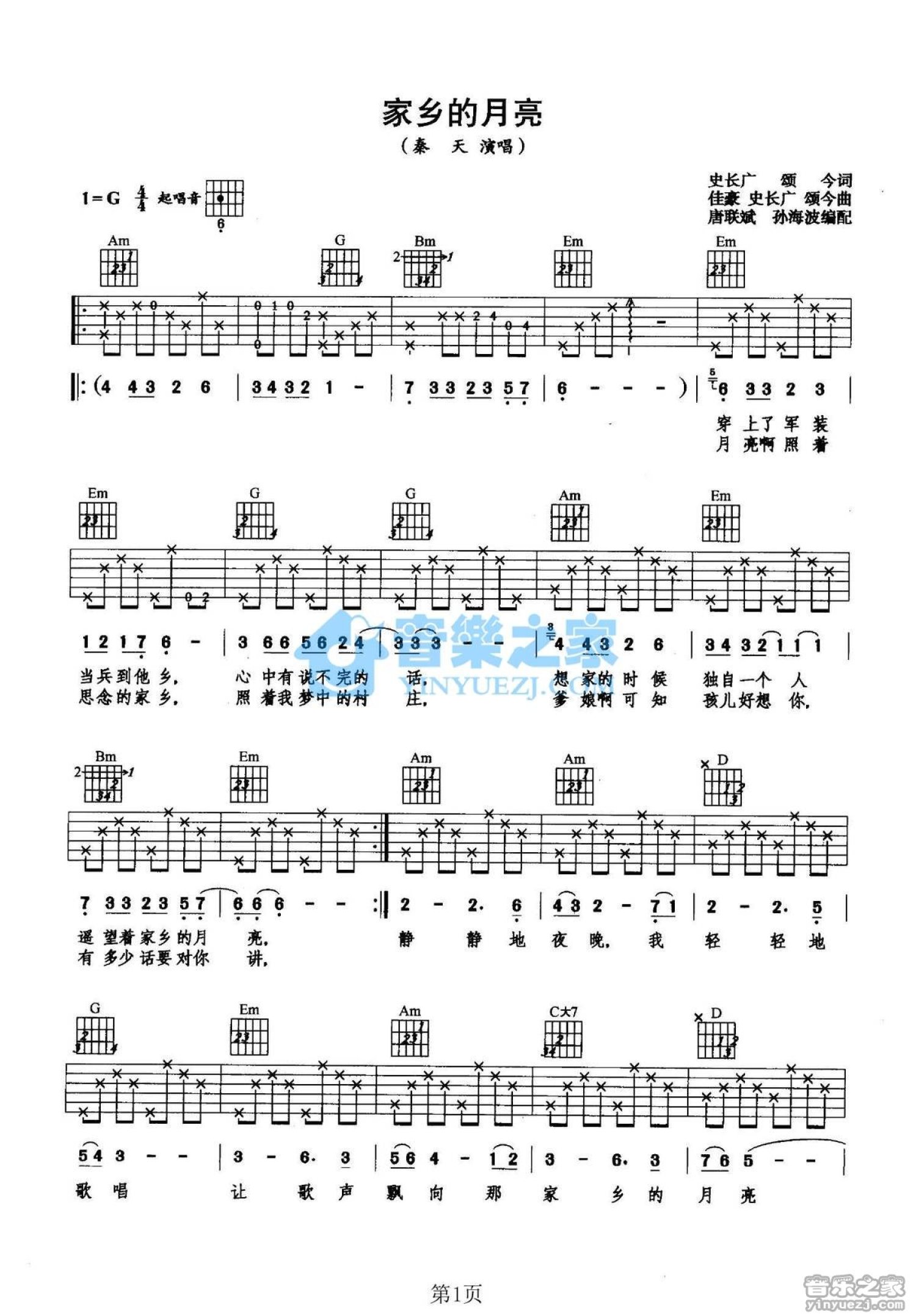家乡的月亮吉他谱 - 秦天 - G调吉他弹唱谱