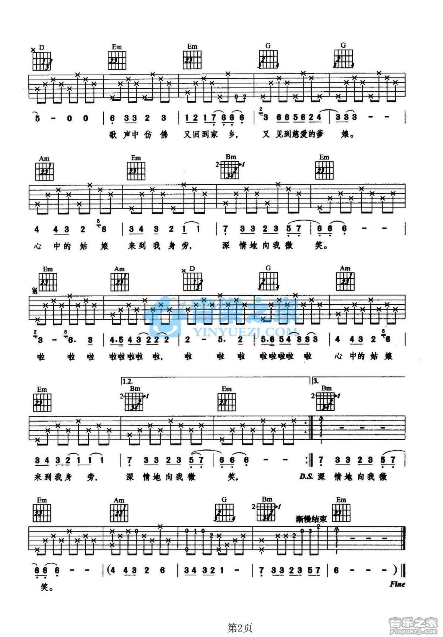 曲谱介绍: G调版《家乡的月亮》吉他弹唱六线谱