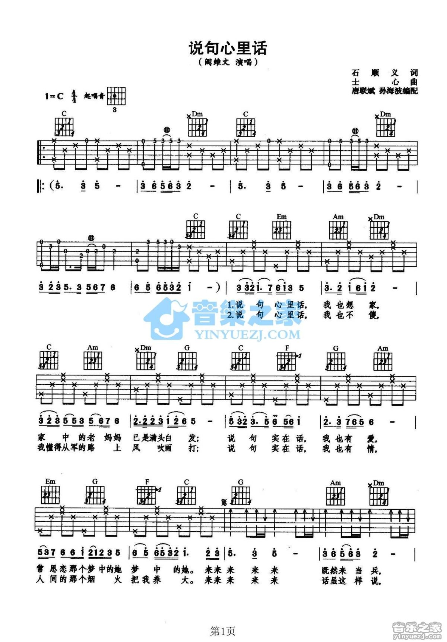 曲谱介绍: C调版阎维文《说句心里话》吉他弹唱六线谱