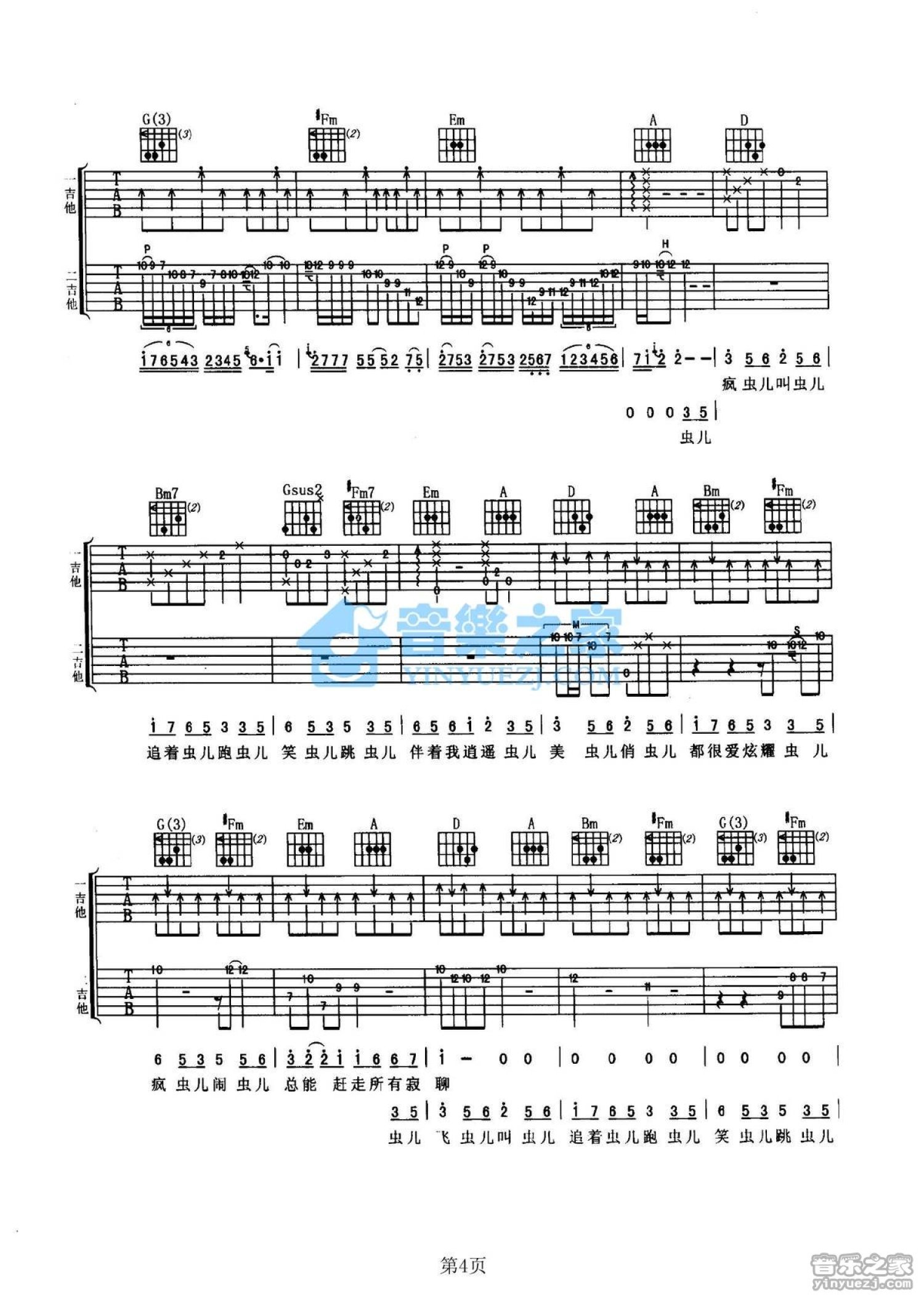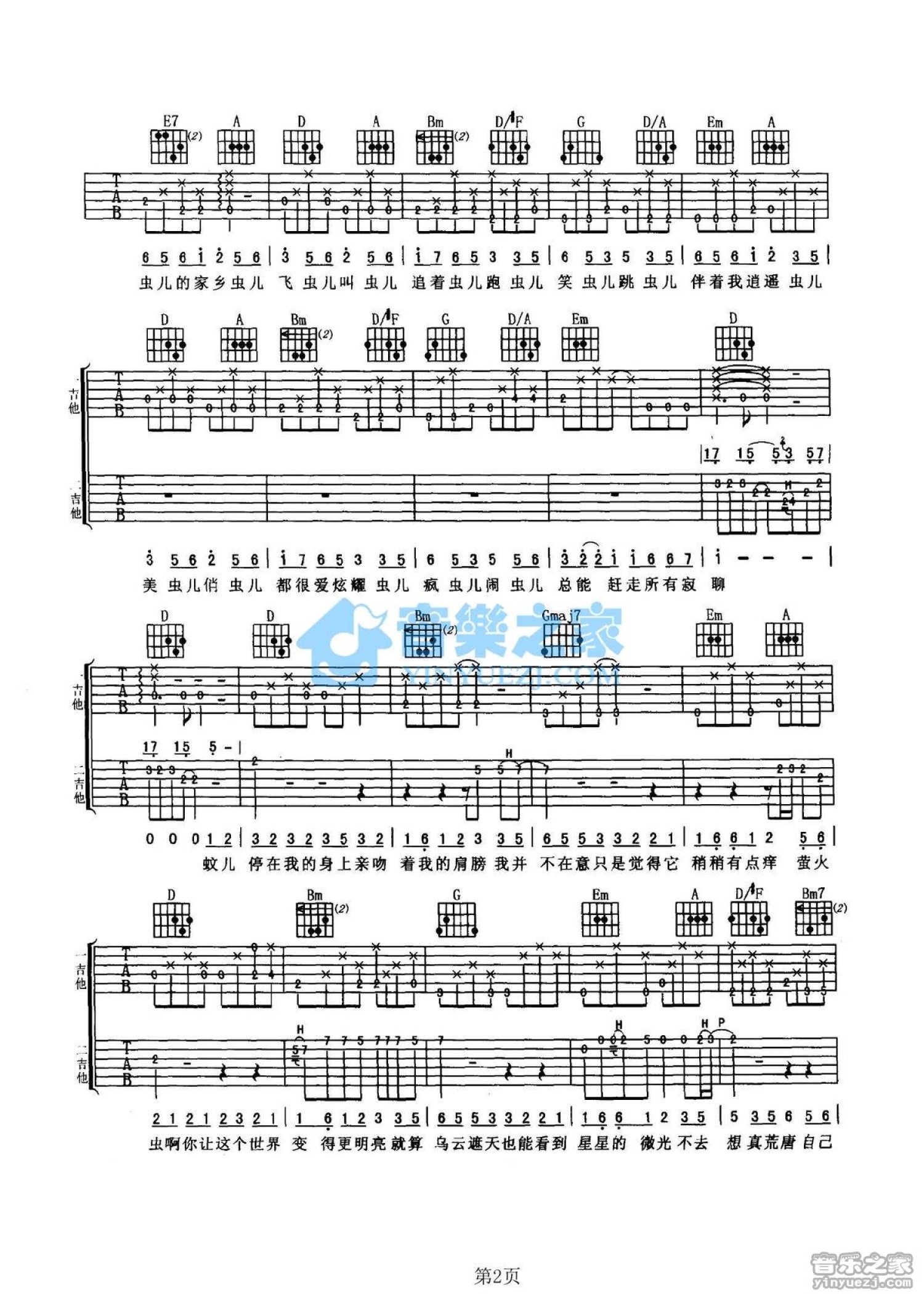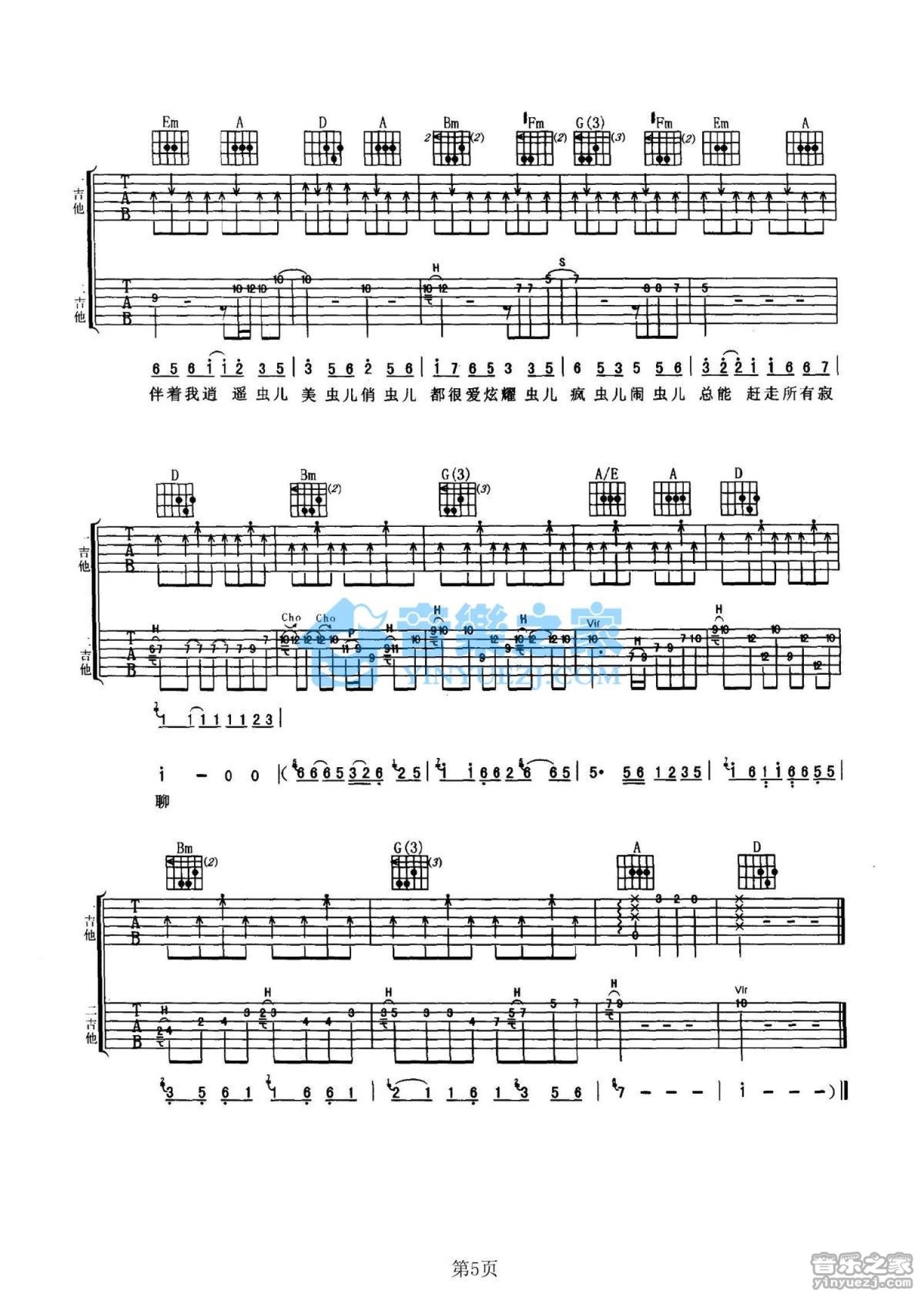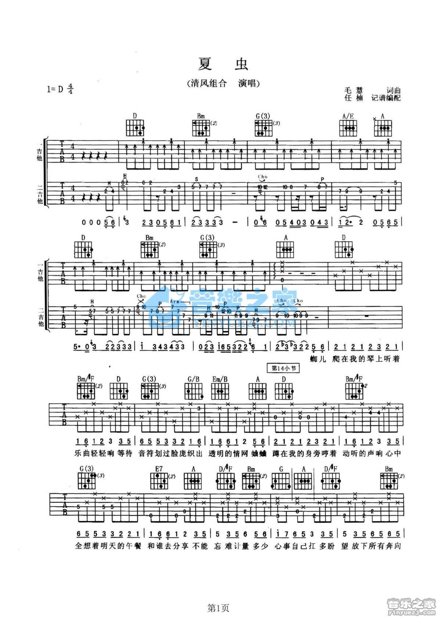 曲谱介绍: D调双吉他版清风组合《夏虫》吉他弹唱六线谱
