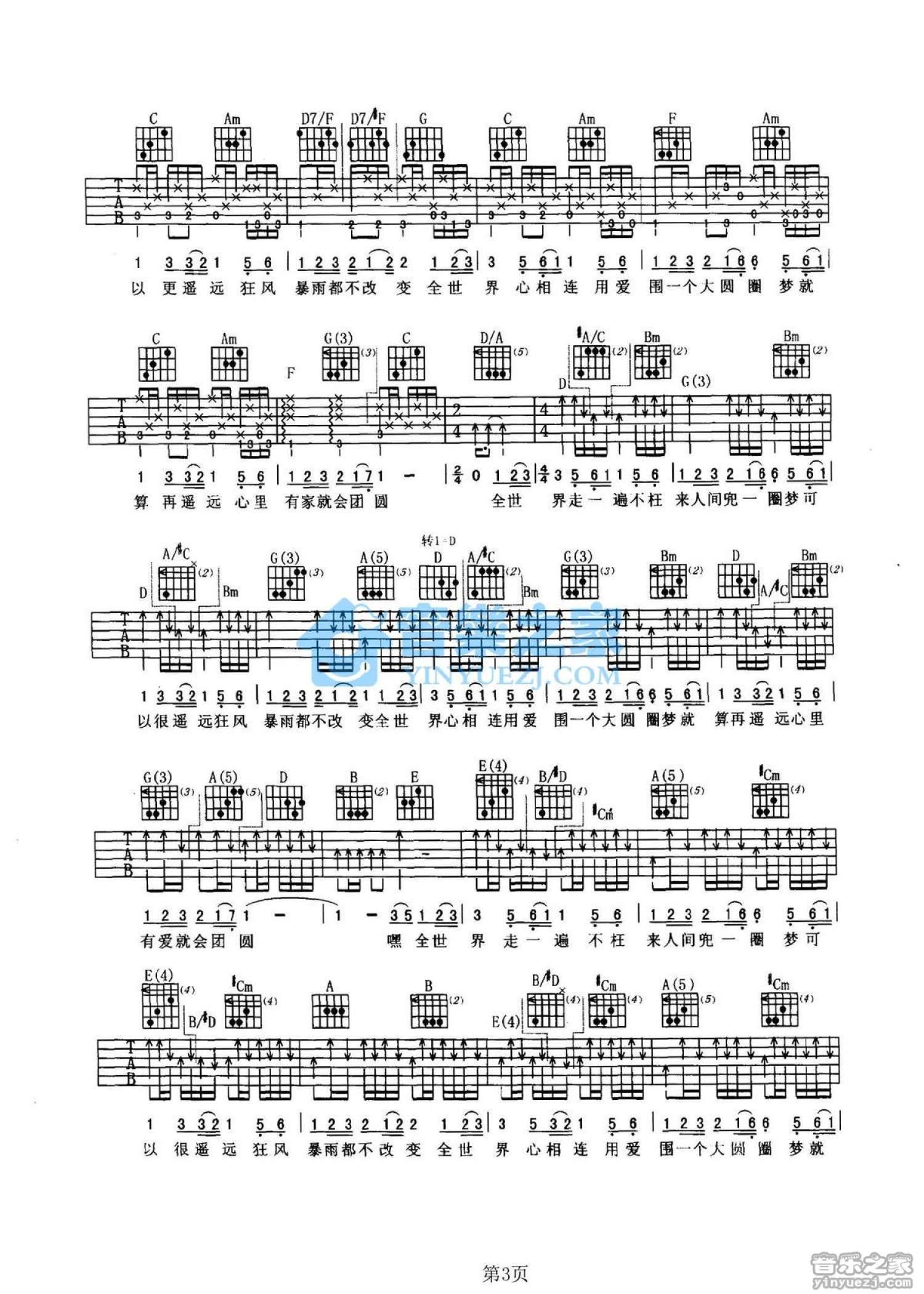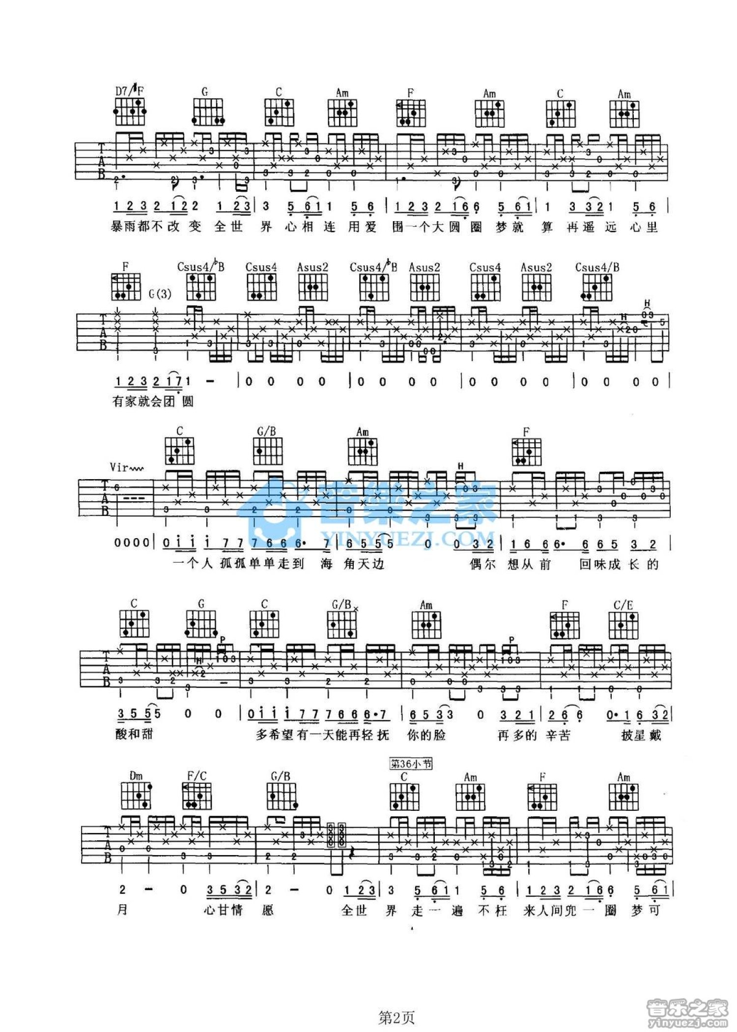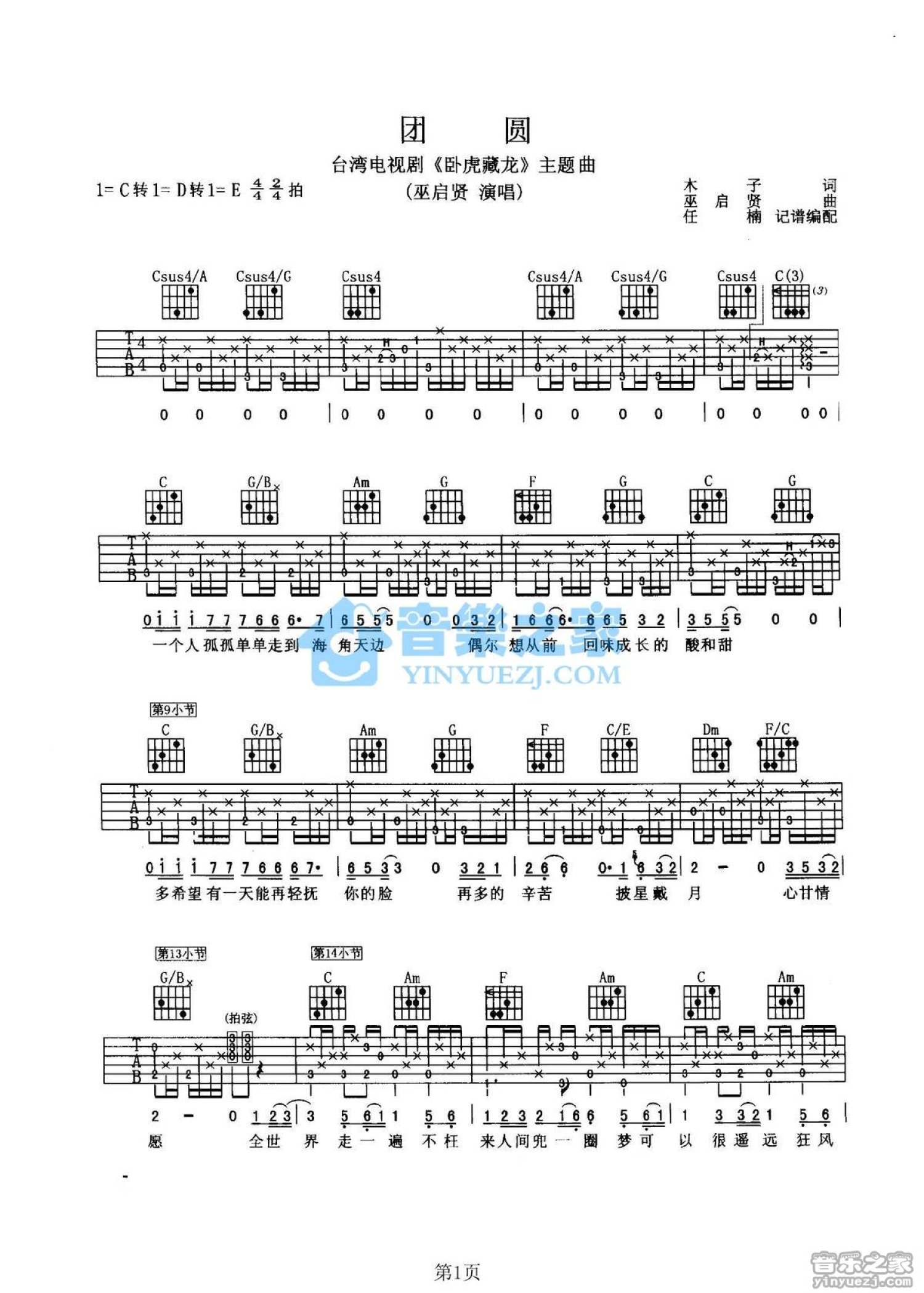 曲谱介绍: C转D转E调版巫启贤《团圆》吉他弹唱六线谱
