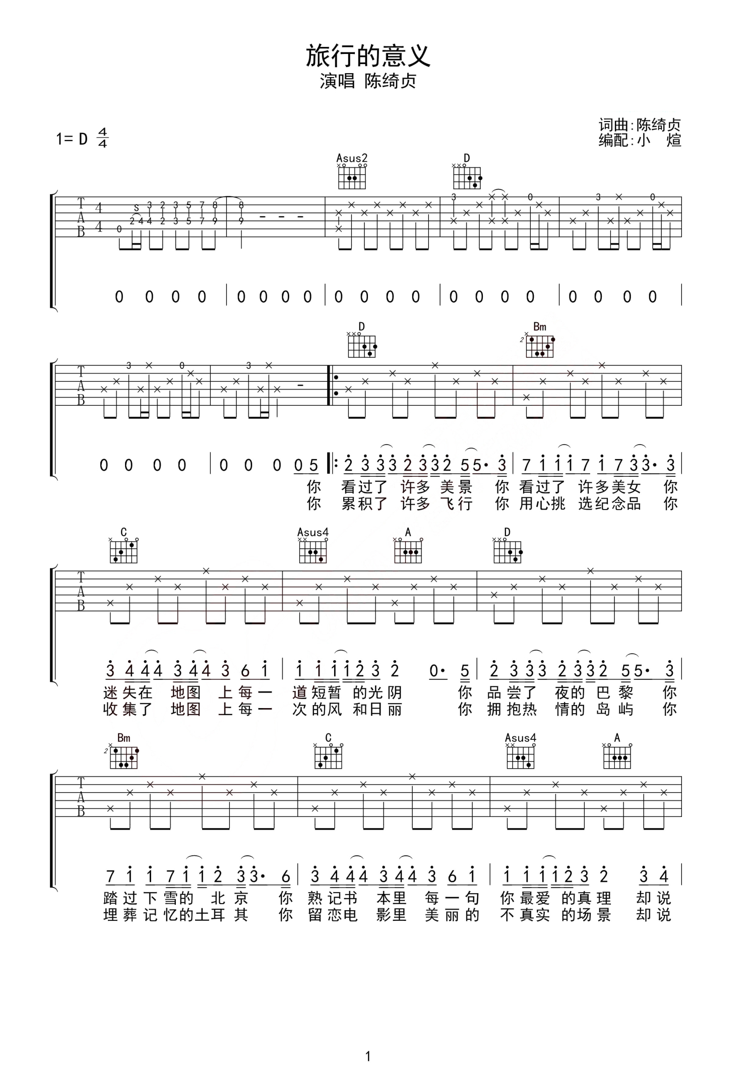 曲谱介绍: 陈绮贞旅行的意义吉他谱,D调指法,本曲旋律特别好听,适合女生自弹自唱,在弹奏的时候,要注意歌曲到后面和弦以及节奏更多的变化,在这些变化上多加练习。旅行的意义吉他弹唱谱。如诗般的歌词,简约优美的旋律,木吉他拨弦声中,感悟一段感情的旅程,那些酸涩甜美的回忆,在轻吟浅唱的歌声里,慢慢闪现。