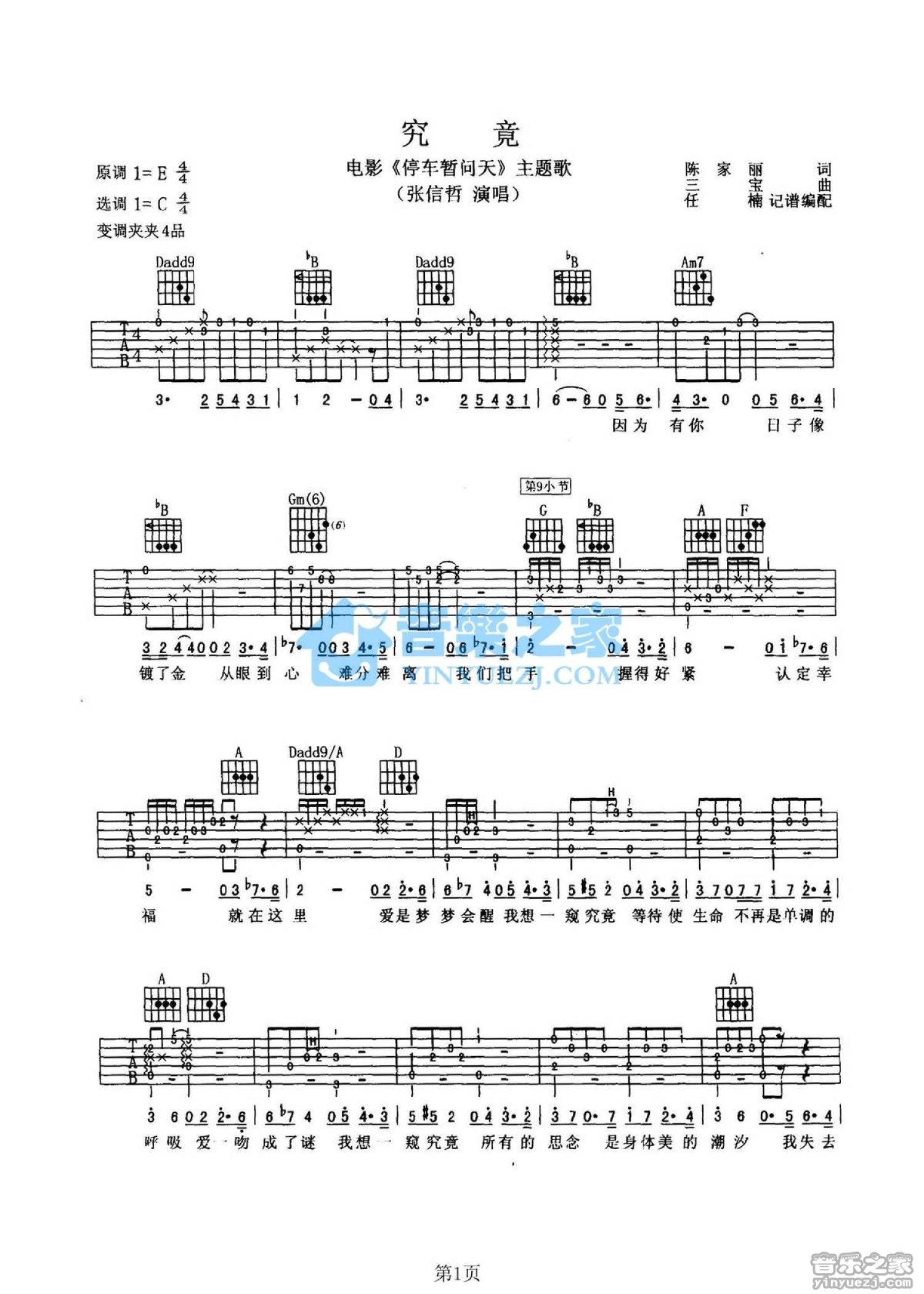 曲谱介绍: C调版张信哲《究竟》吉他弹唱六线谱