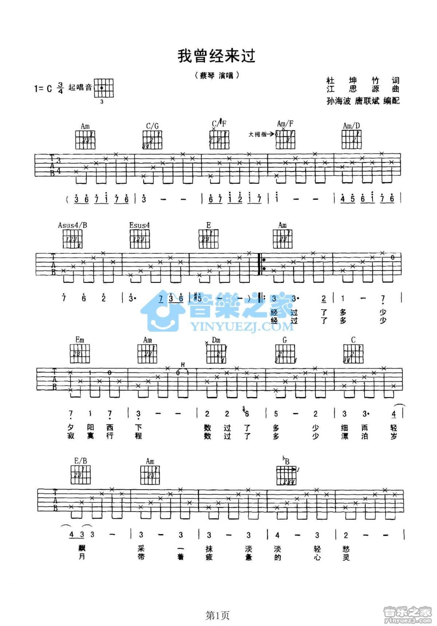 曲谱介绍: C调版蔡琴《我曾经来过》吉他弹唱六线谱