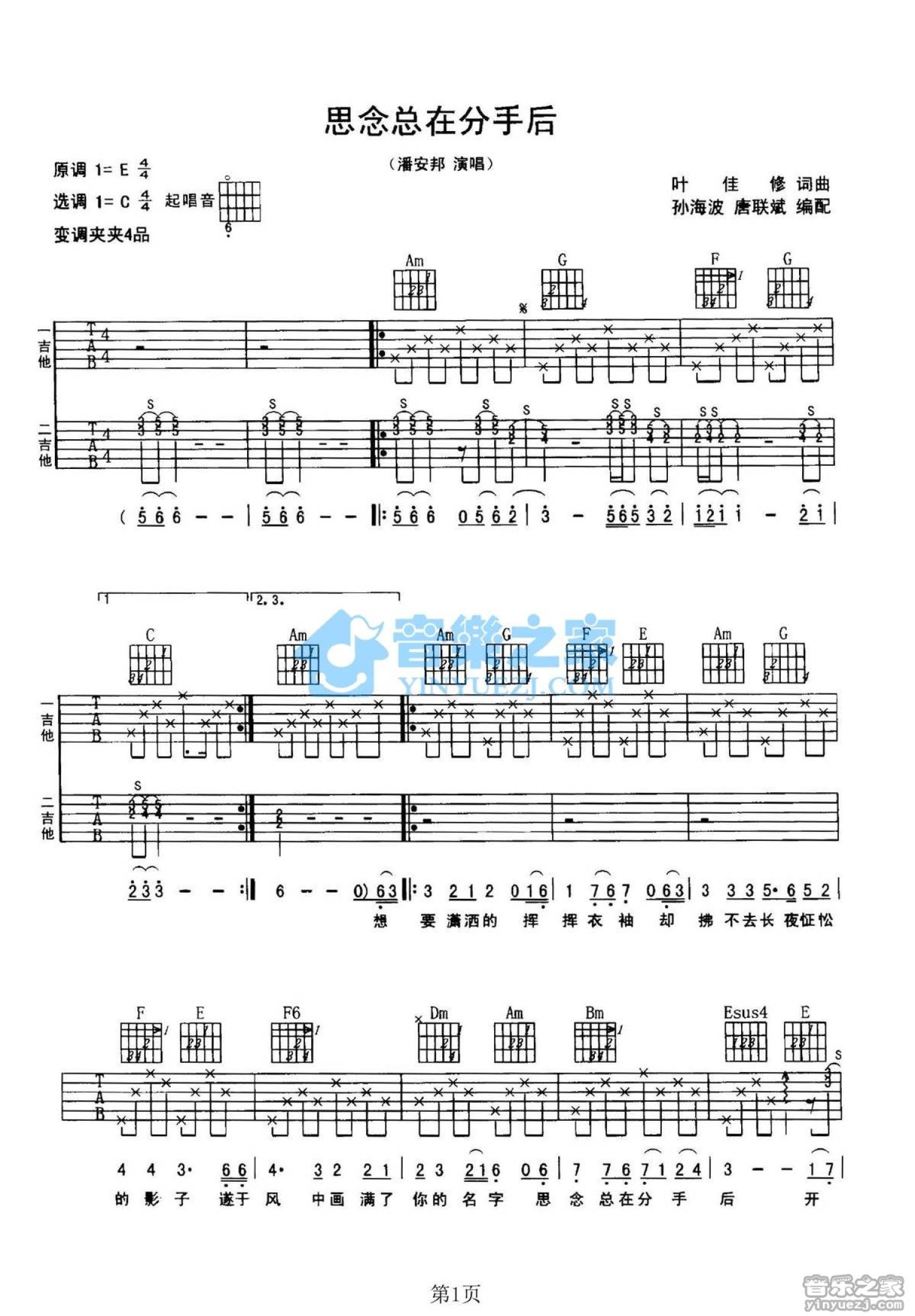 曲谱介绍: C调双吉他版潘安邦《思念总在分手后》吉他弹唱六线谱