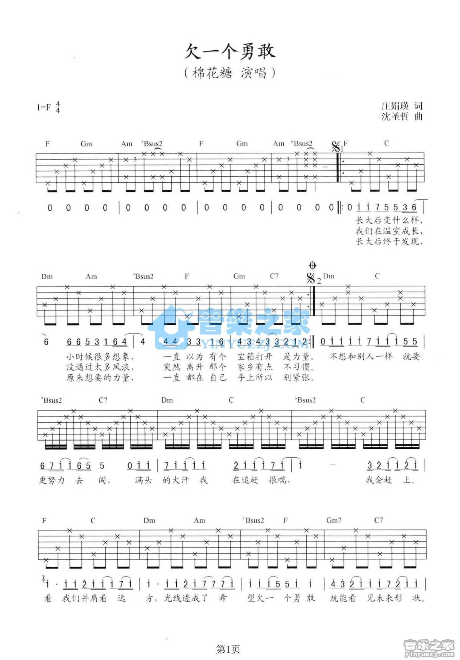 曲谱介绍: F调版《欠一个勇敢》吉他弹唱六线谱