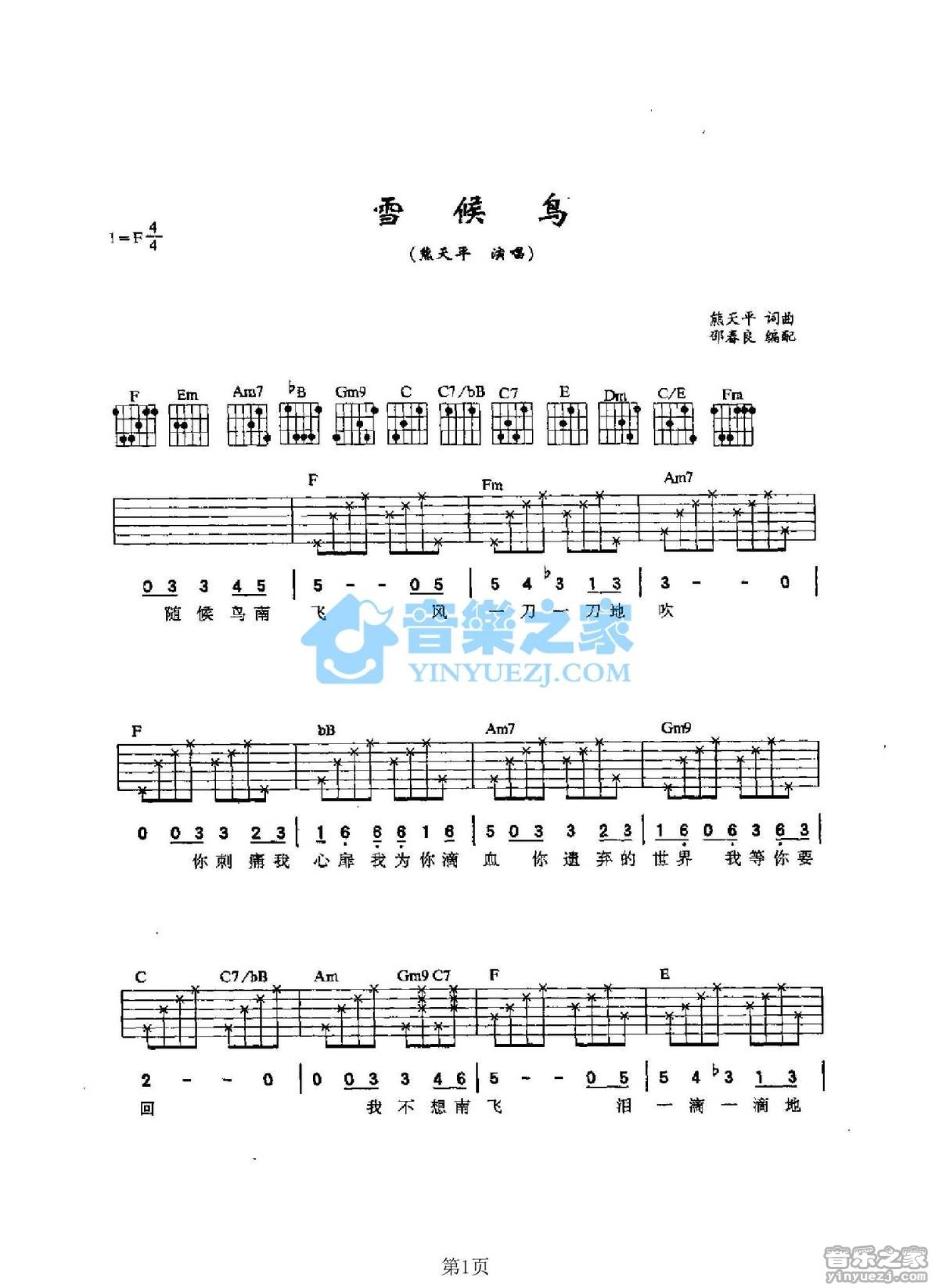 曲谱介绍: F调版熊天平《雪候鸟》吉他弹唱六线谱