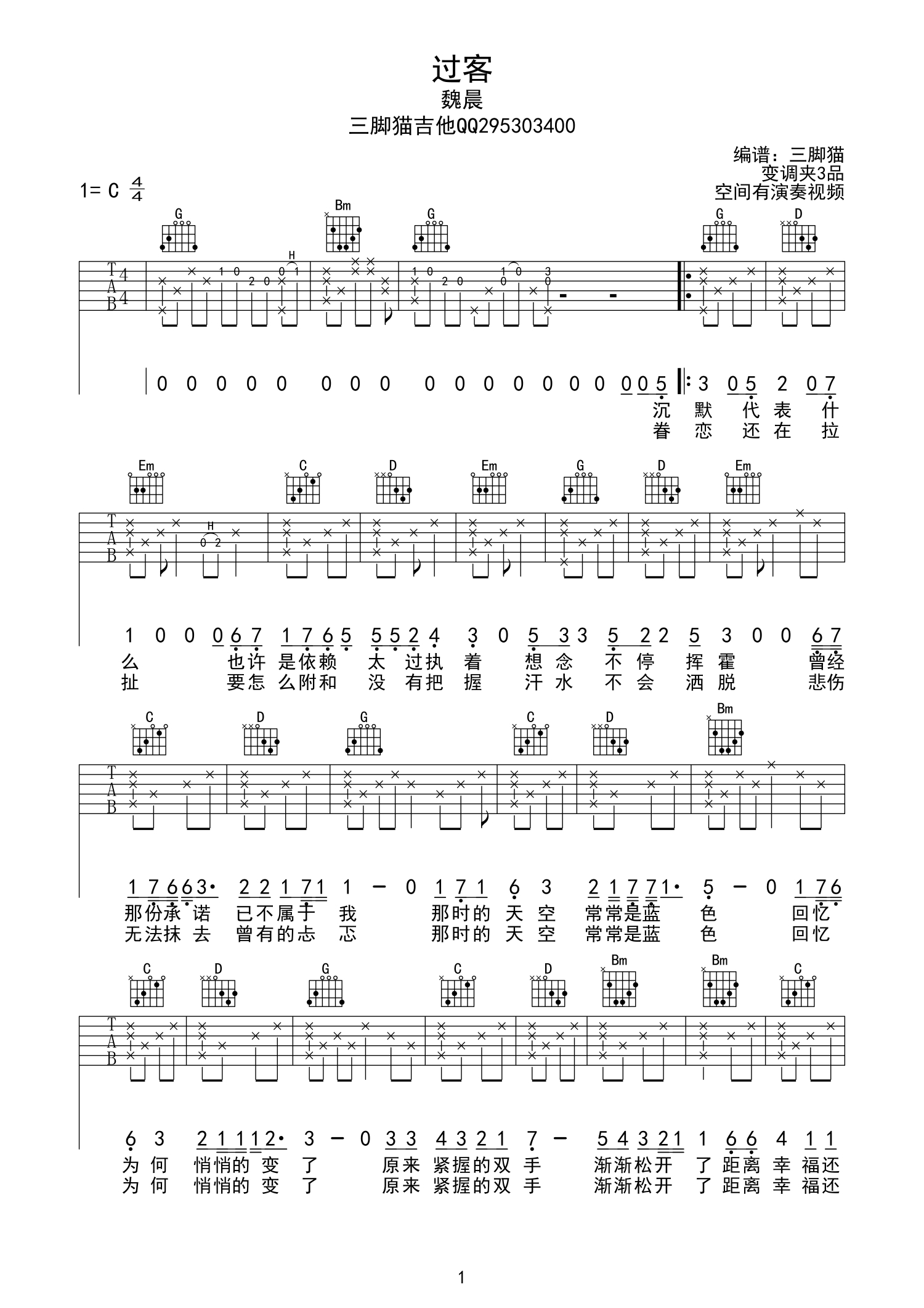 曲谱介绍: 魏晨 过客吉他谱六线谱【C调高清版】