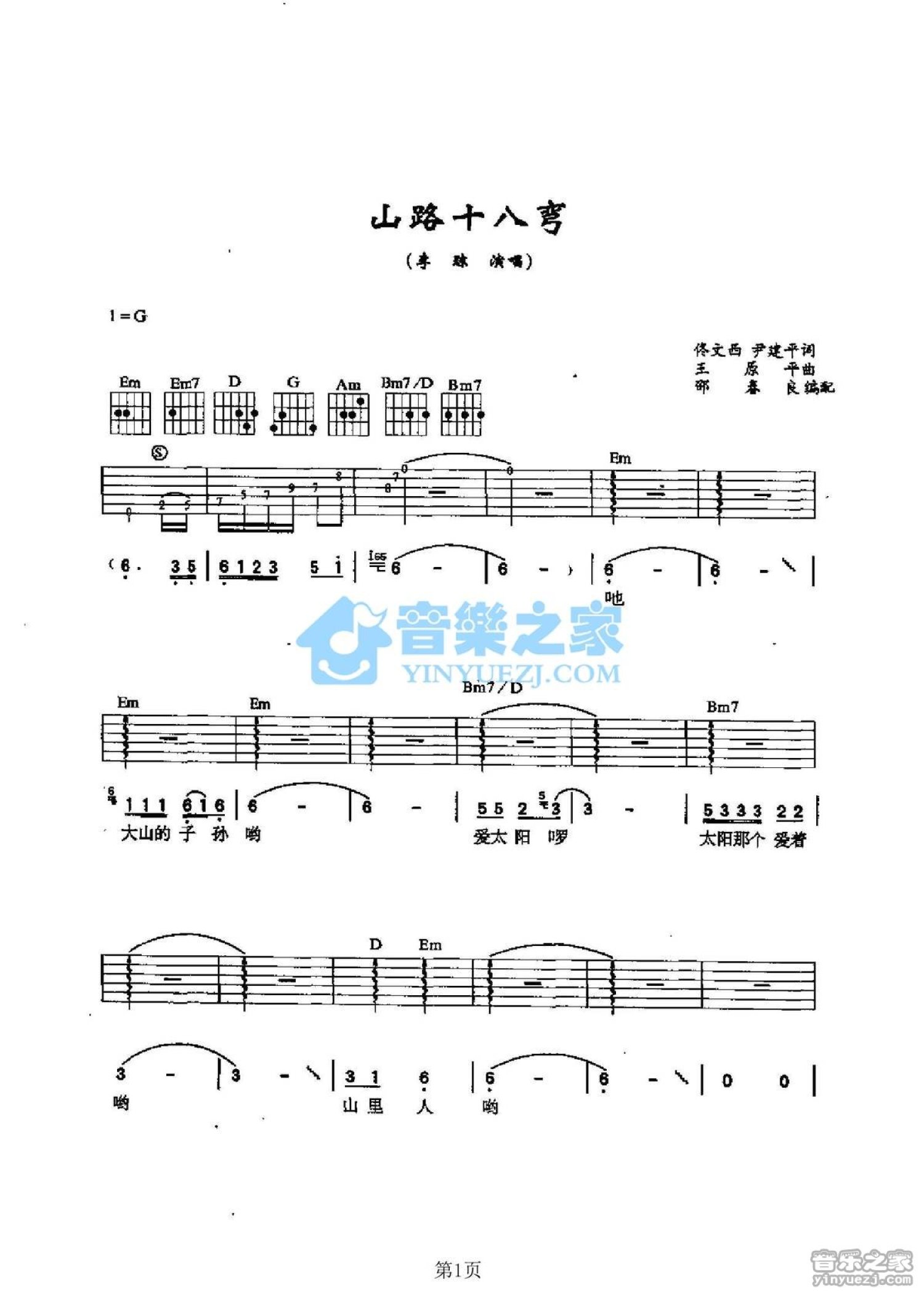 曲谱介绍: G调版李琼《山路十八弯》吉他弹唱六线谱