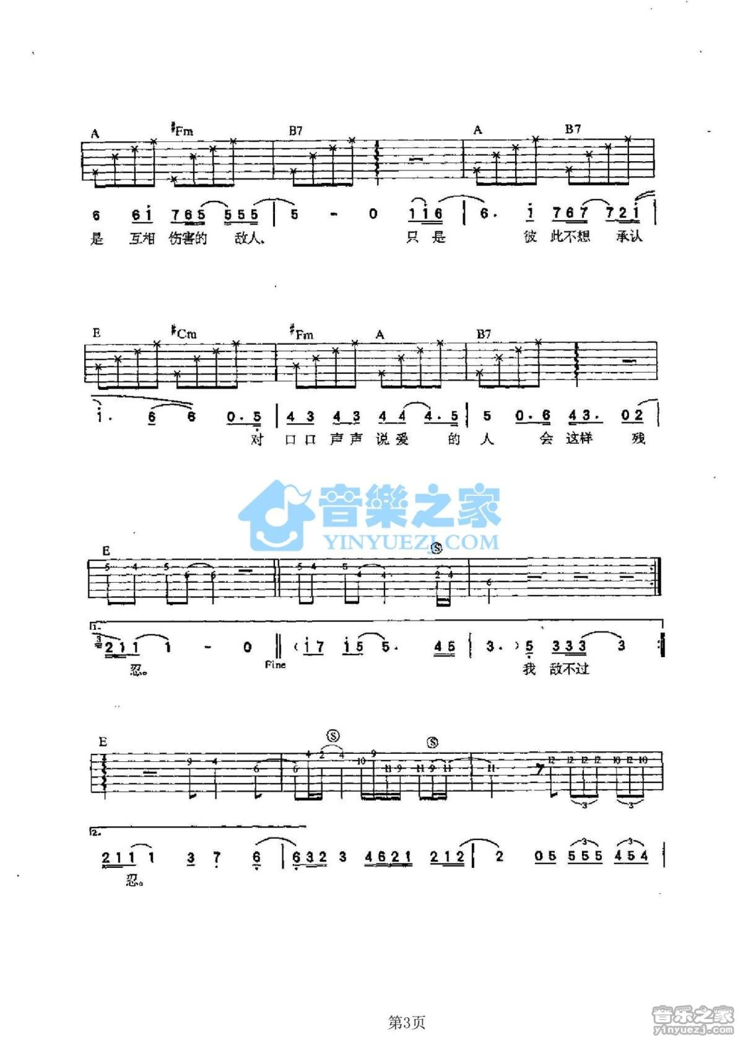曲谱介绍: E调版郑中基《敌人》吉他弹唱六线谱