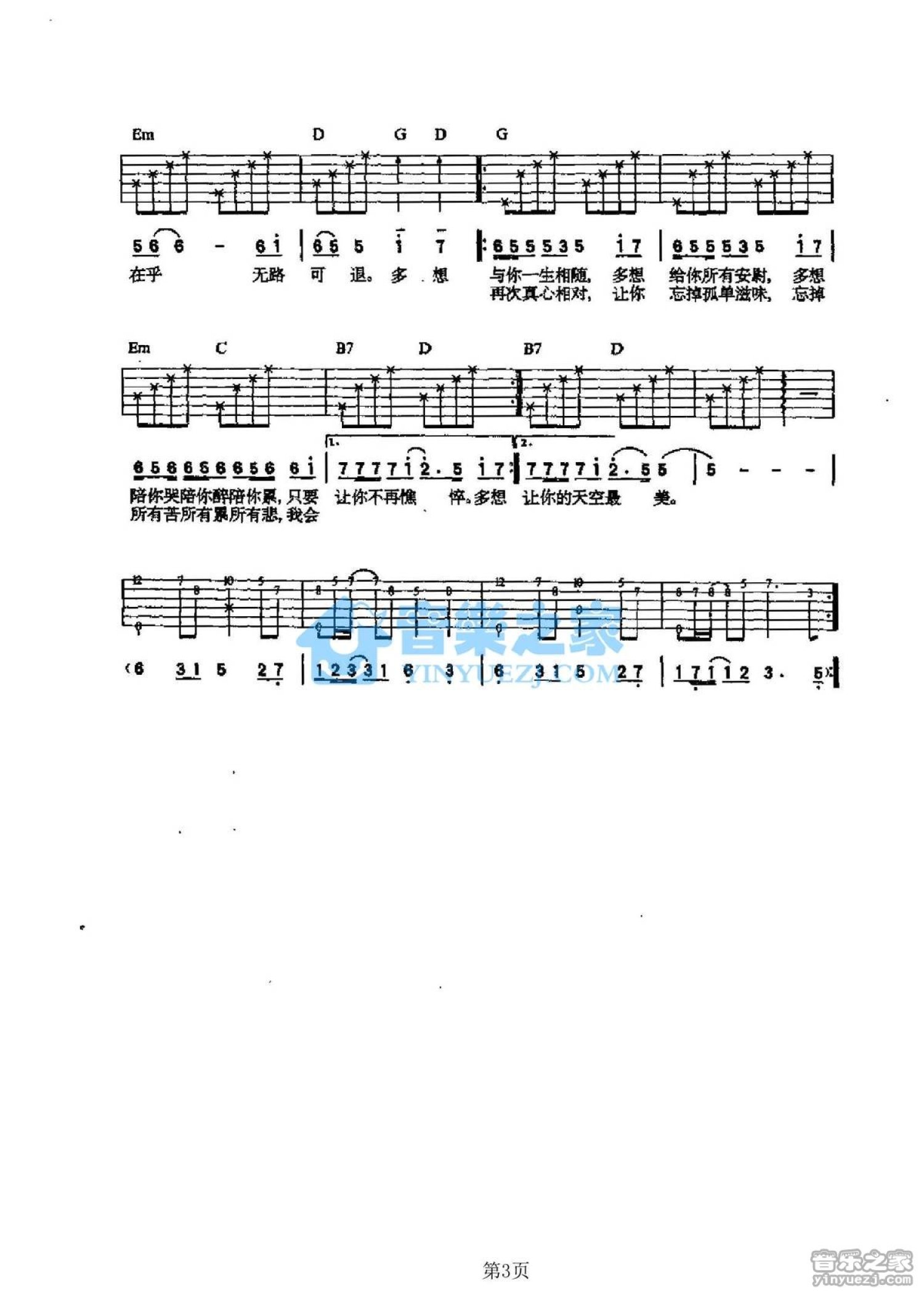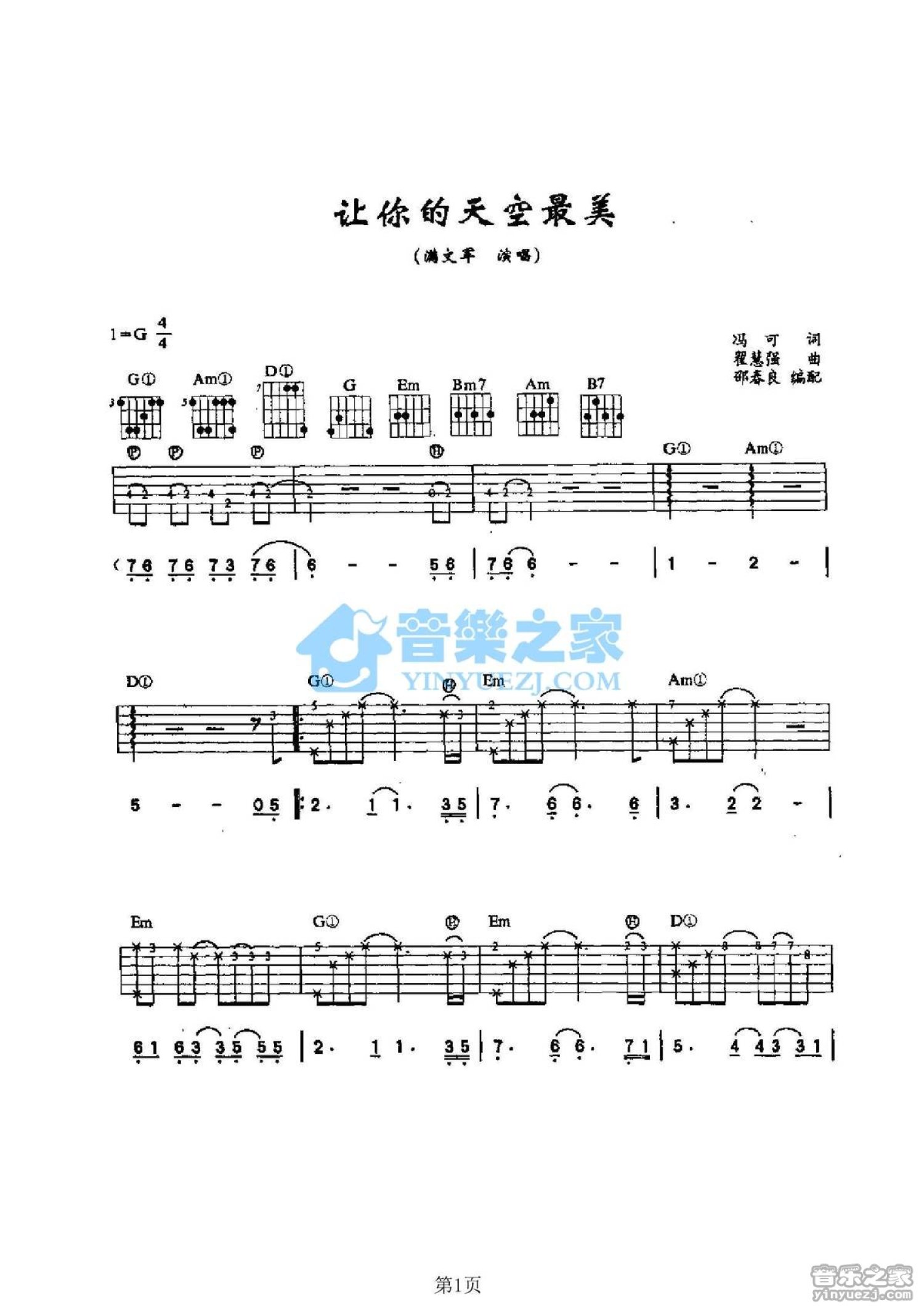 曲谱介绍: G调版满文军《让你的天空最美》吉他弹唱六线谱