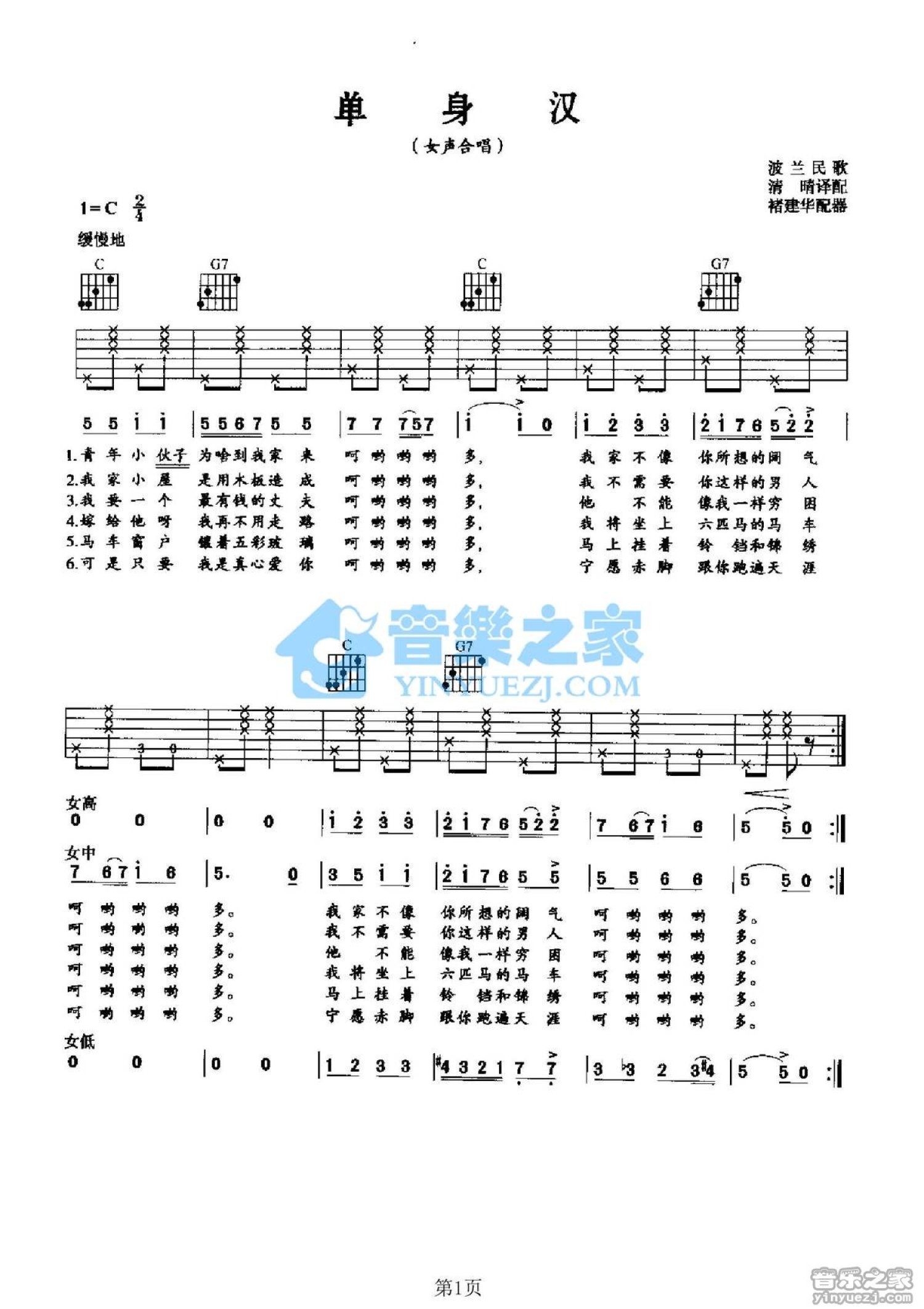 曲谱介绍: C调版波兰民歌《单身汉》吉他弹唱六线谱