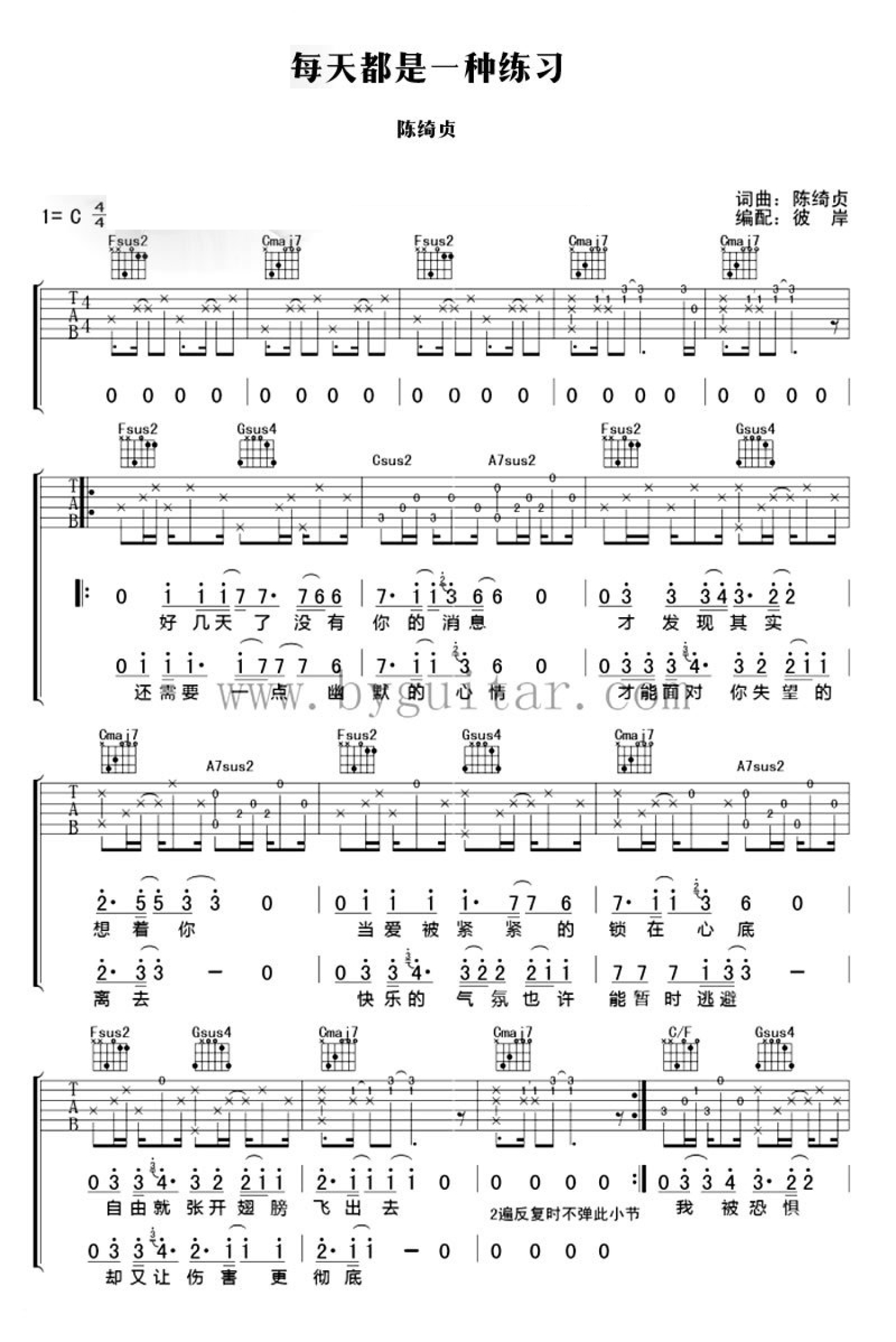 每天都是一种练习吉他谱 - 陈绮贞 - C调吉他弹唱谱