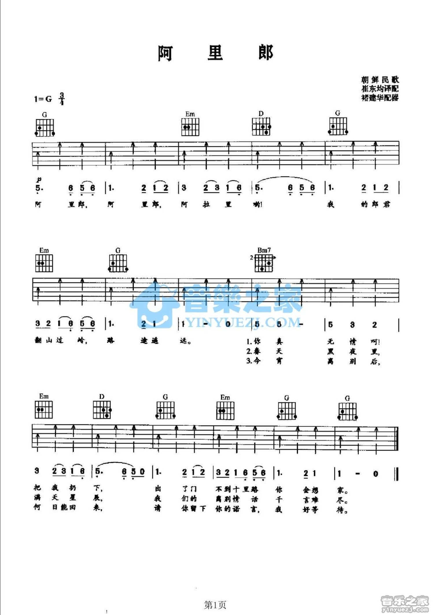 曲谱介绍: G调版朝鲜民歌《阿里郎》吉他弹唱六线谱