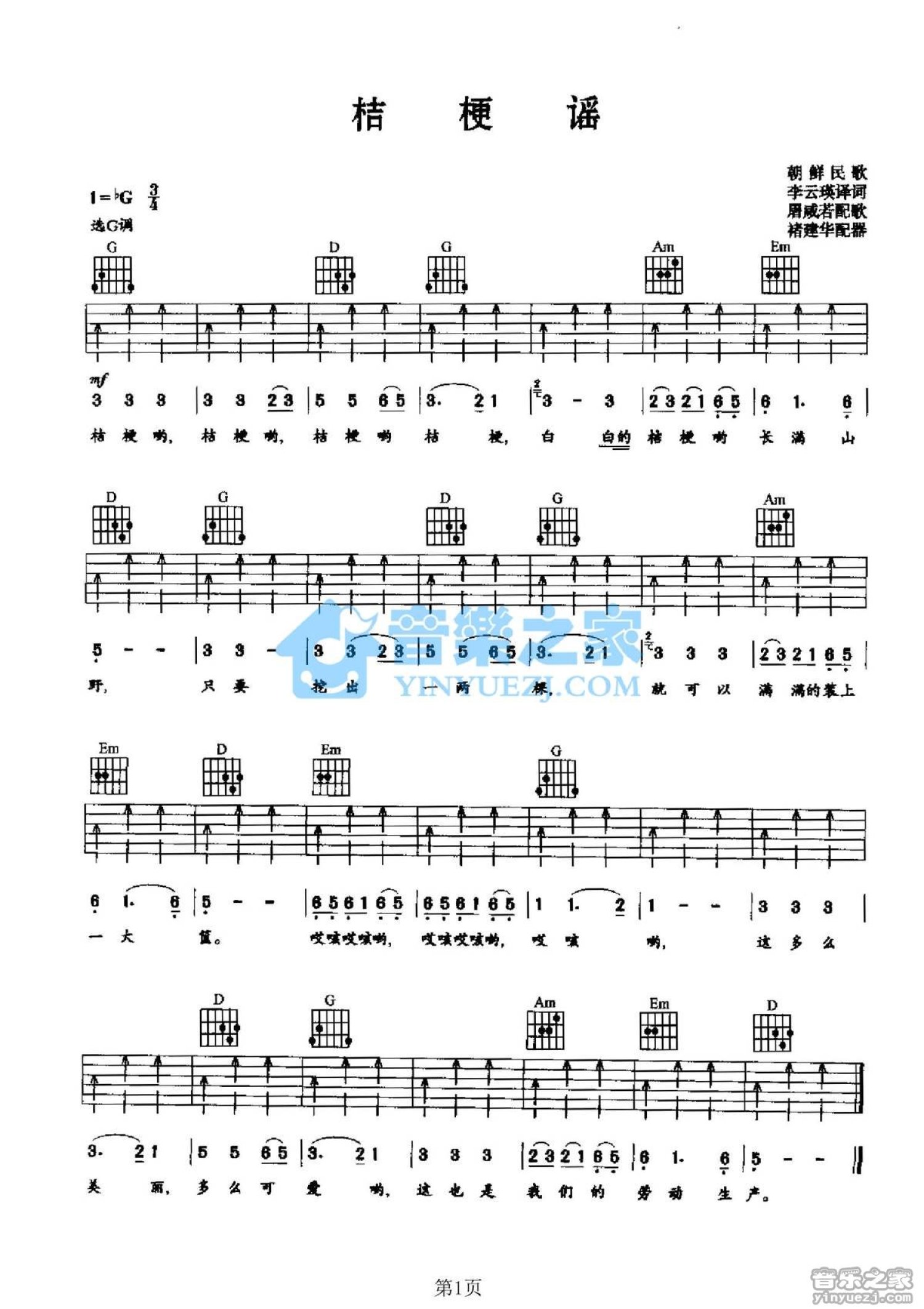 曲谱介绍: G调版朝鲜民歌《桔梗谣》吉他弹唱六线谱