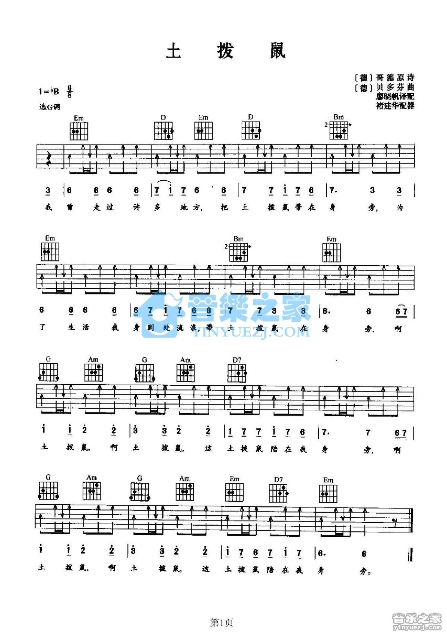 曲谱介绍: G调版德国民歌《土拨鼠》吉他弹唱六线谱