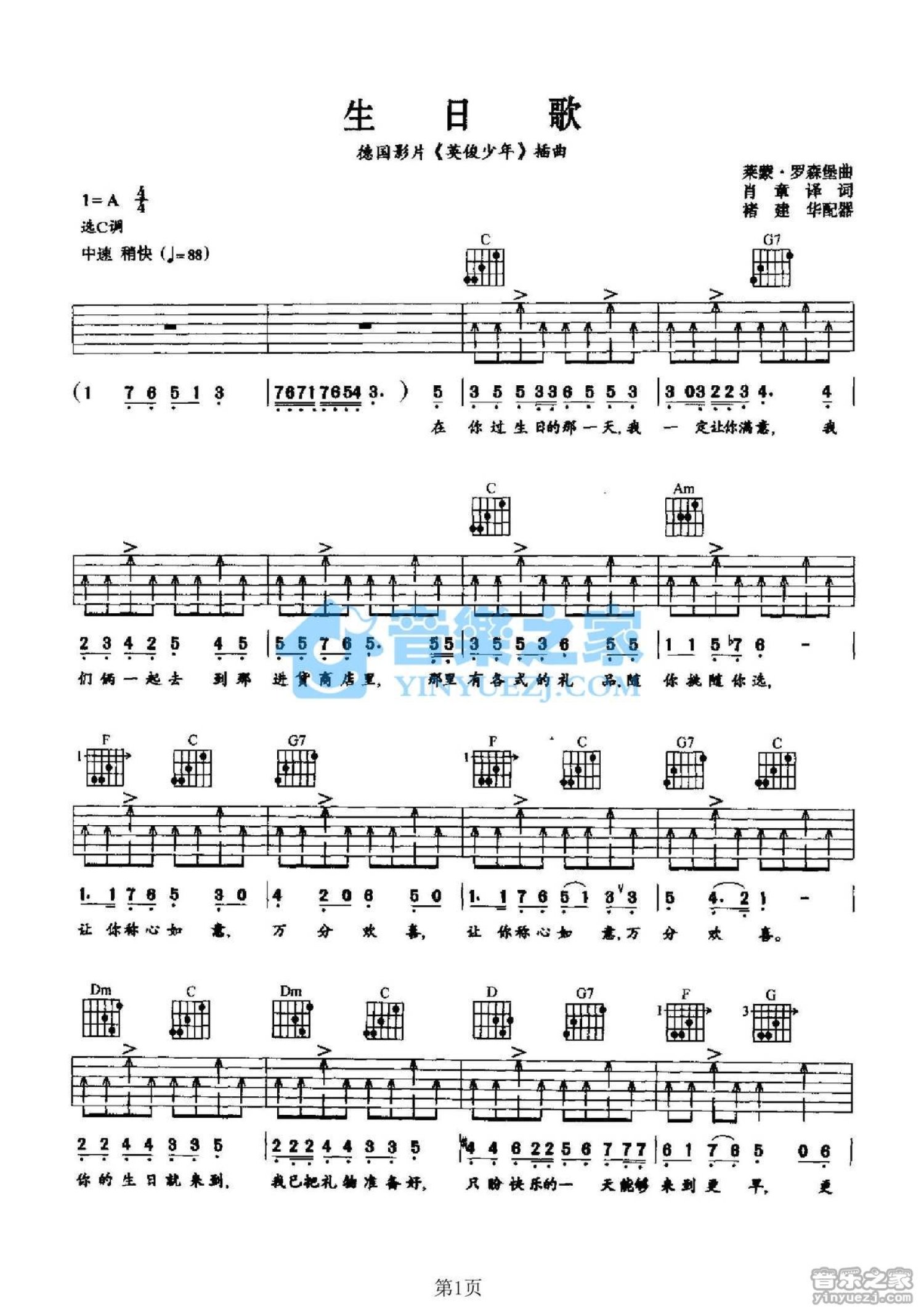 曲谱介绍: C调版《生日歌》吉他弹唱六线谱