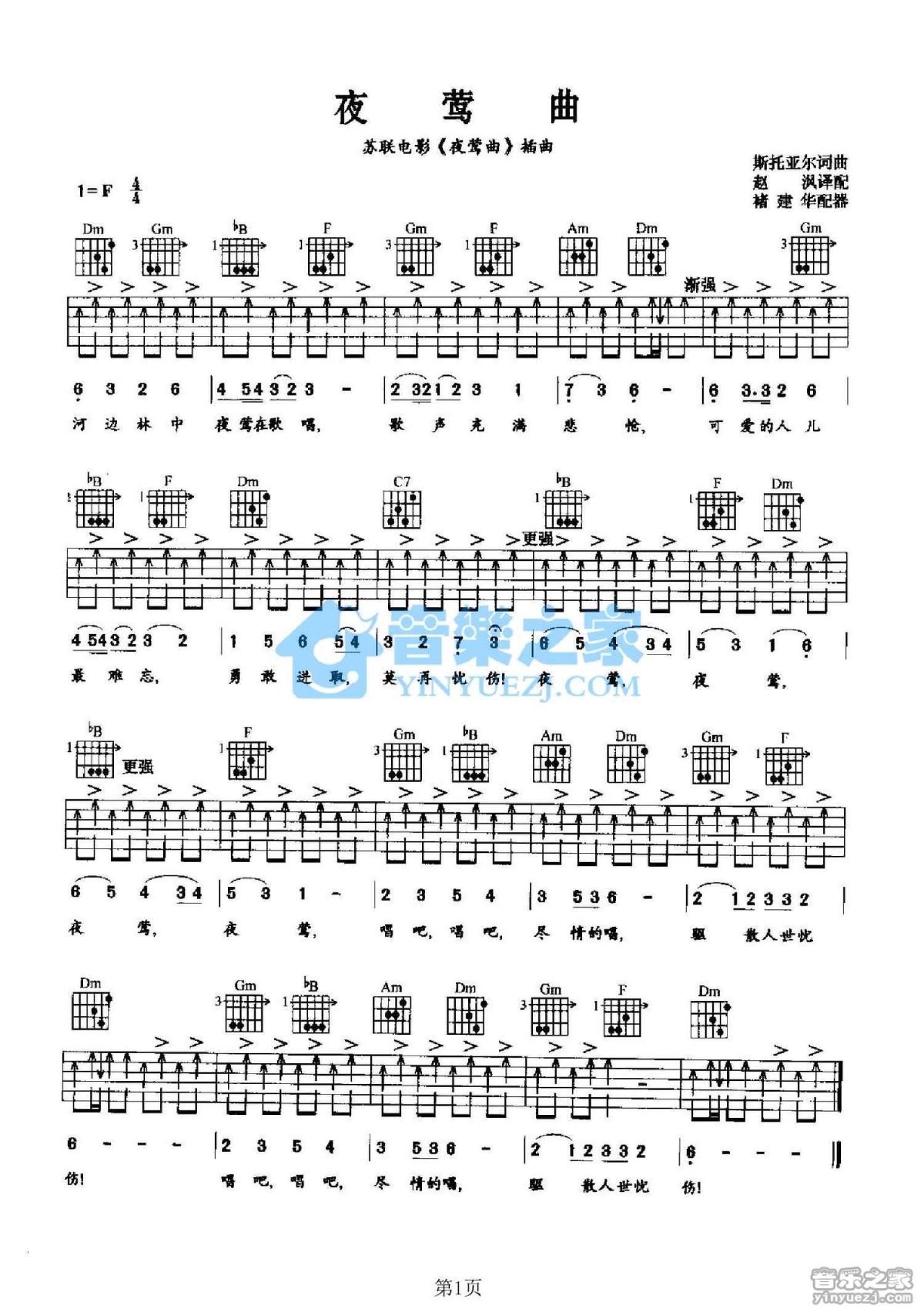 曲谱介绍: F调版苏联歌曲《夜莺曲》吉他弹唱六线谱